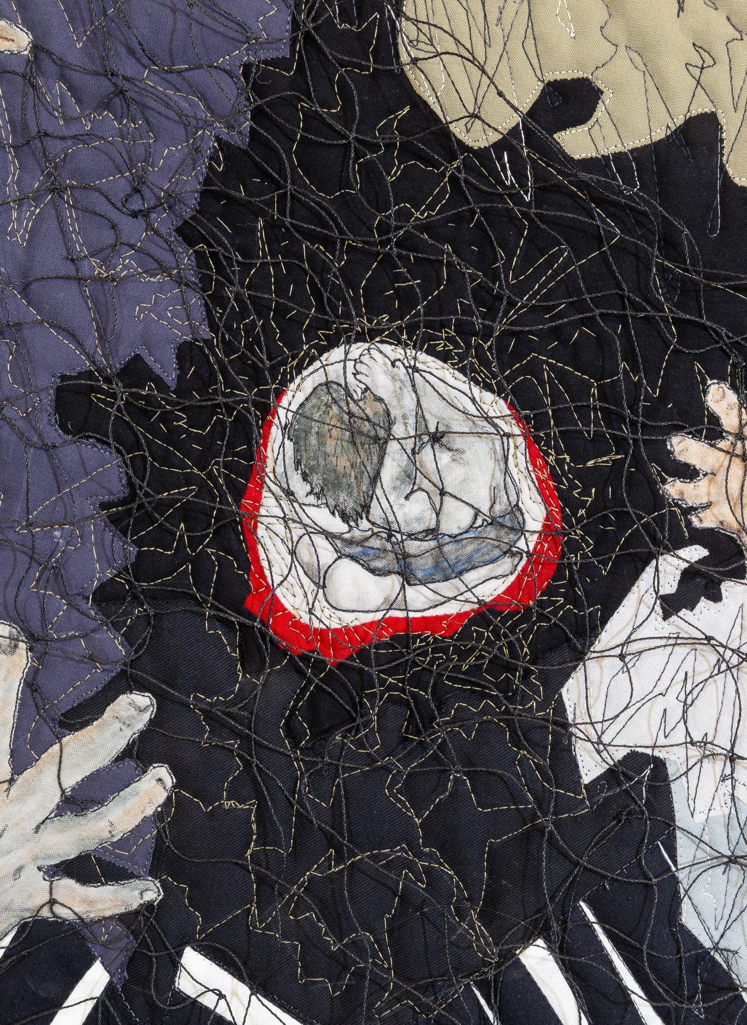 Painted, collaged, hand and machine appliquéd, free motion quilted