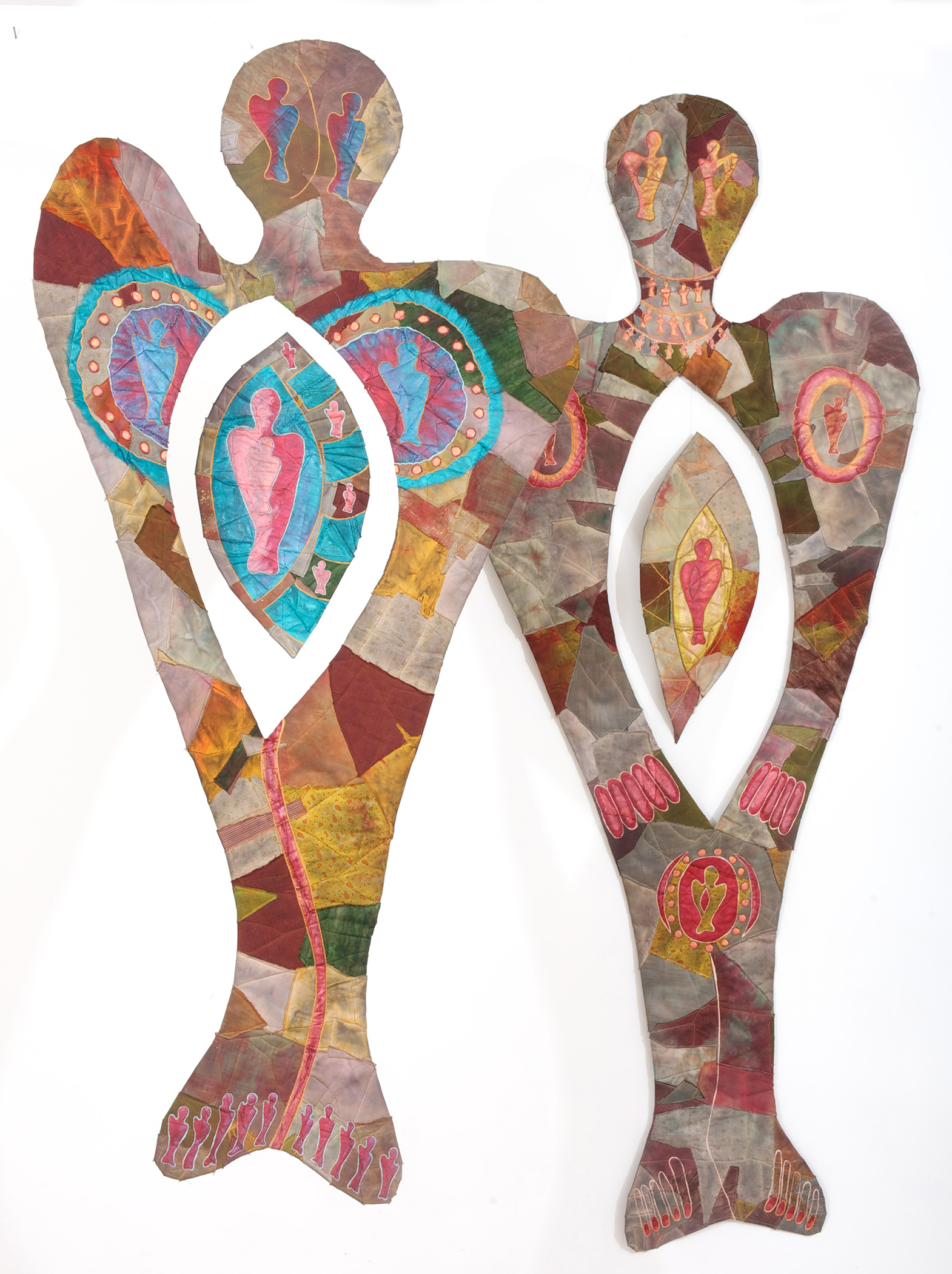 Mixed fabrics and threads, dye, fabric paint, oil paintsticks