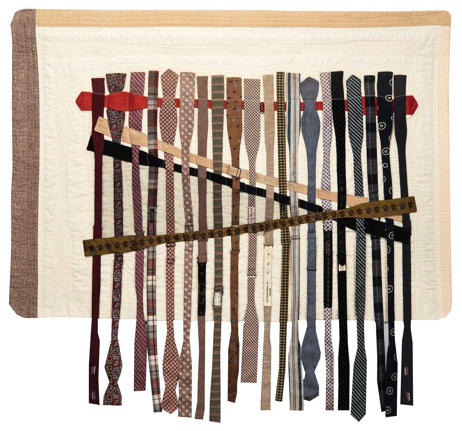 Vintage repurposed bowties weave across the shirting background. Hanging, they loosen and form a shadow layer against the shirting and wall. Quilting lines echo the tie shapes with horizontal and vertical "ghost" tie shapes. Men's shirting fabric, curved corners, and sepia borders also evoke the past and a sense of loss—bittersweet memories of a young father's early death. The bottom edge lets go of the tie ends, again suggesting a life unfinished. Yet the family remains stitched together. We smile at the 1950s fabric and labels; an amusing peek back in sartorial history.
