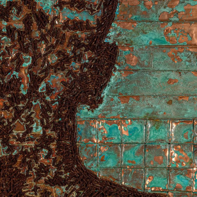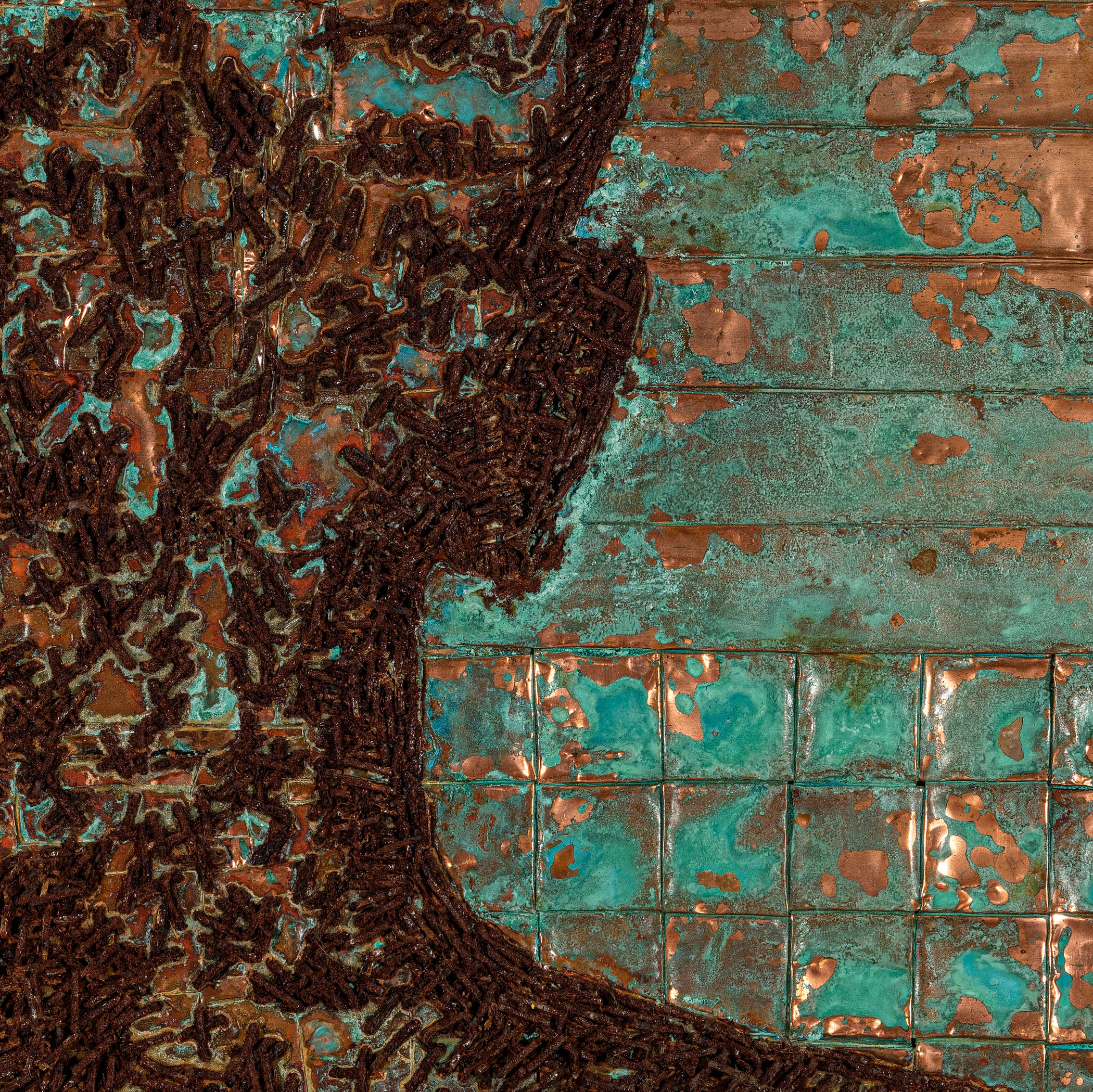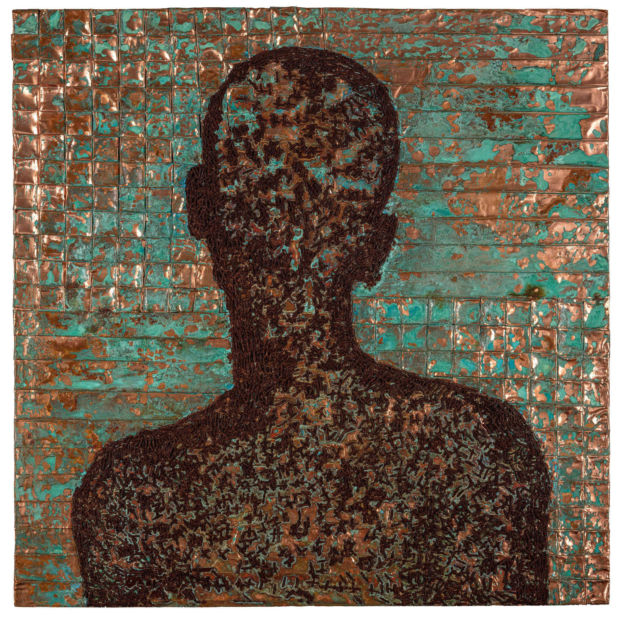 With no drawing materials but the duct tape I had left the show to buy, I found a piece of scrap wood and “drew” a quick sketch with the tape on the board. Back at my studio, I knew I wanted to maintain the sense and atmosphere of our conversation, the decay of the surroundings, the slope of his shoulders, the tilt of his head, and most of all, his spirit.