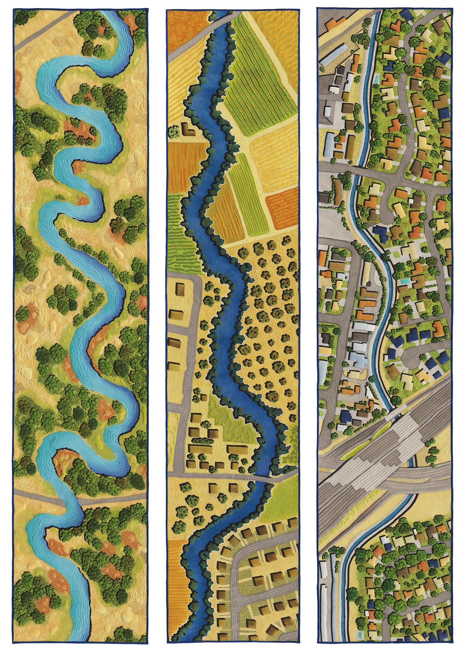 Based on historical maps, aerial photographs and satellite imagery, this series examines the changes to a local urban creek. Using historical ecology to recreate the visual landscape from 1873, the meandering creek is surrounded by grassland and willows. Based on aerial photographs from 1946, the next artwork shows the creek somewhat straightened to accommodate agriculture but still free flowing and able to flood; the first post-World War II suburb appears in the lower right, signaling the end of the free-flowing creek as flooding and housing are incompatible. The third artwork, based on contemporary satellite images, shows a very developed landscape and the creek encased in a narrow concrete channel. Given that our underground aquifers are recharged through gravel streambeds and we will need to rely on them more in the future of climate change, how will we redesign how we manage our urban creeks going forward?