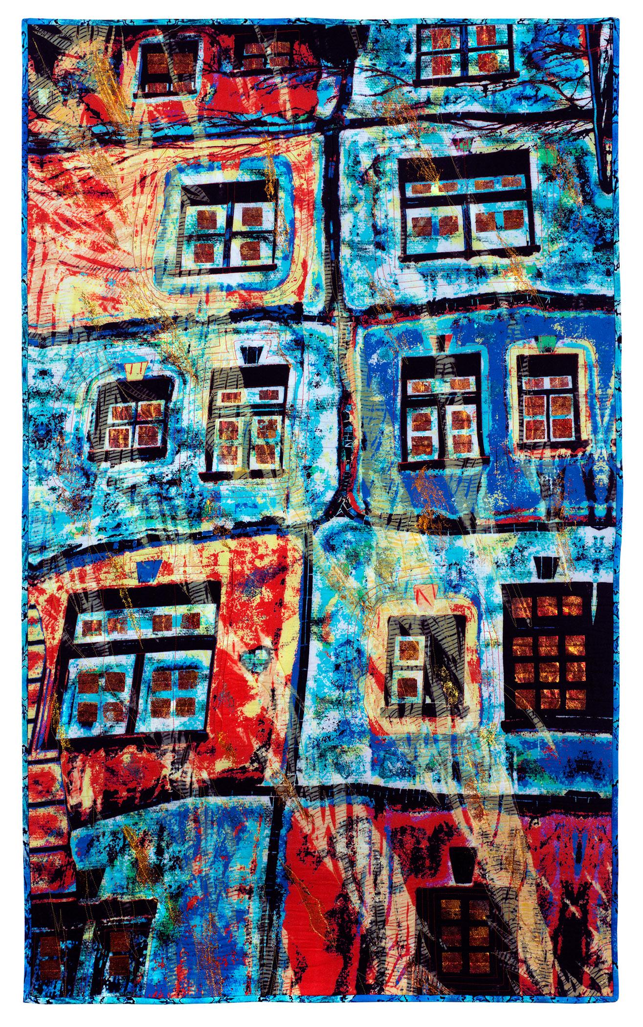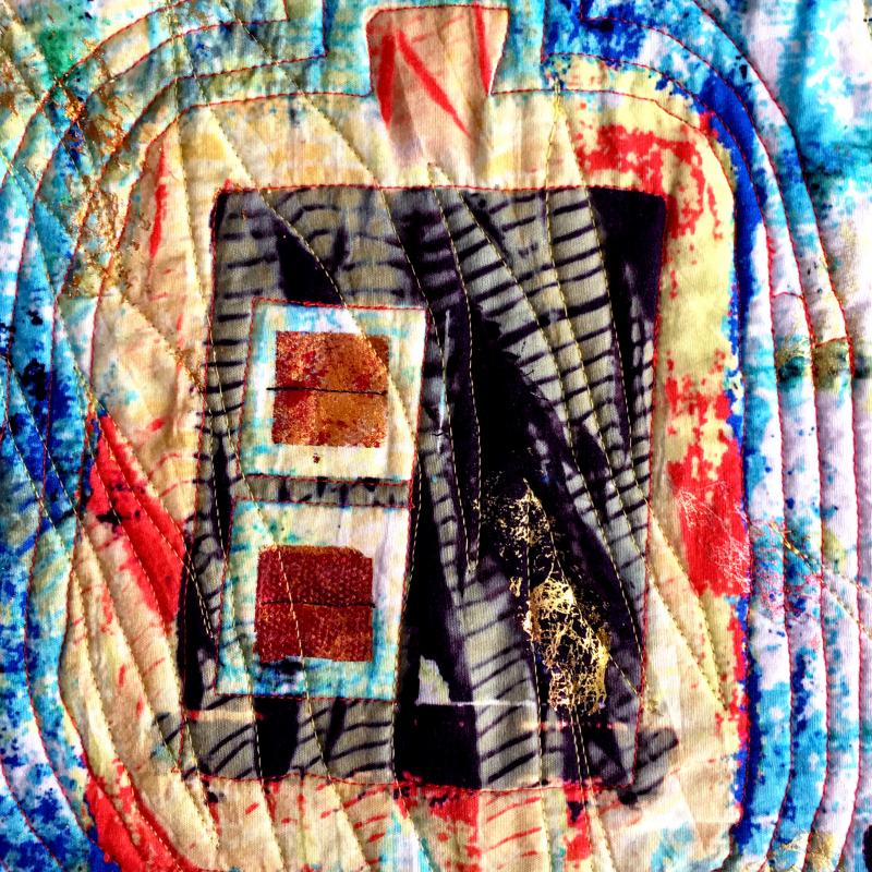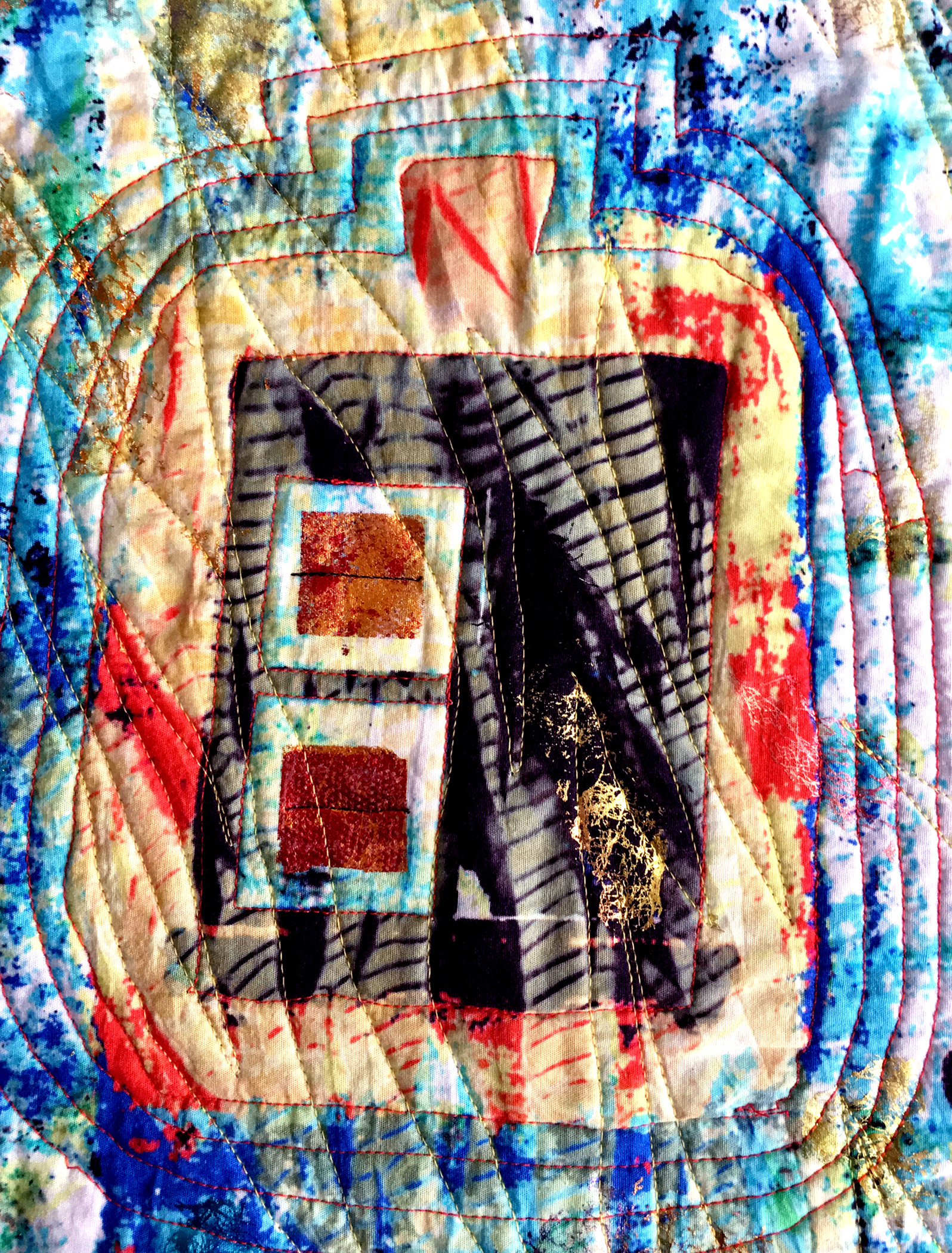 Cotton, artist's photo and scans, dye, waxed thread, foil, metallic fabric paint