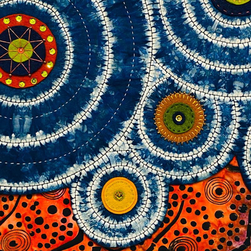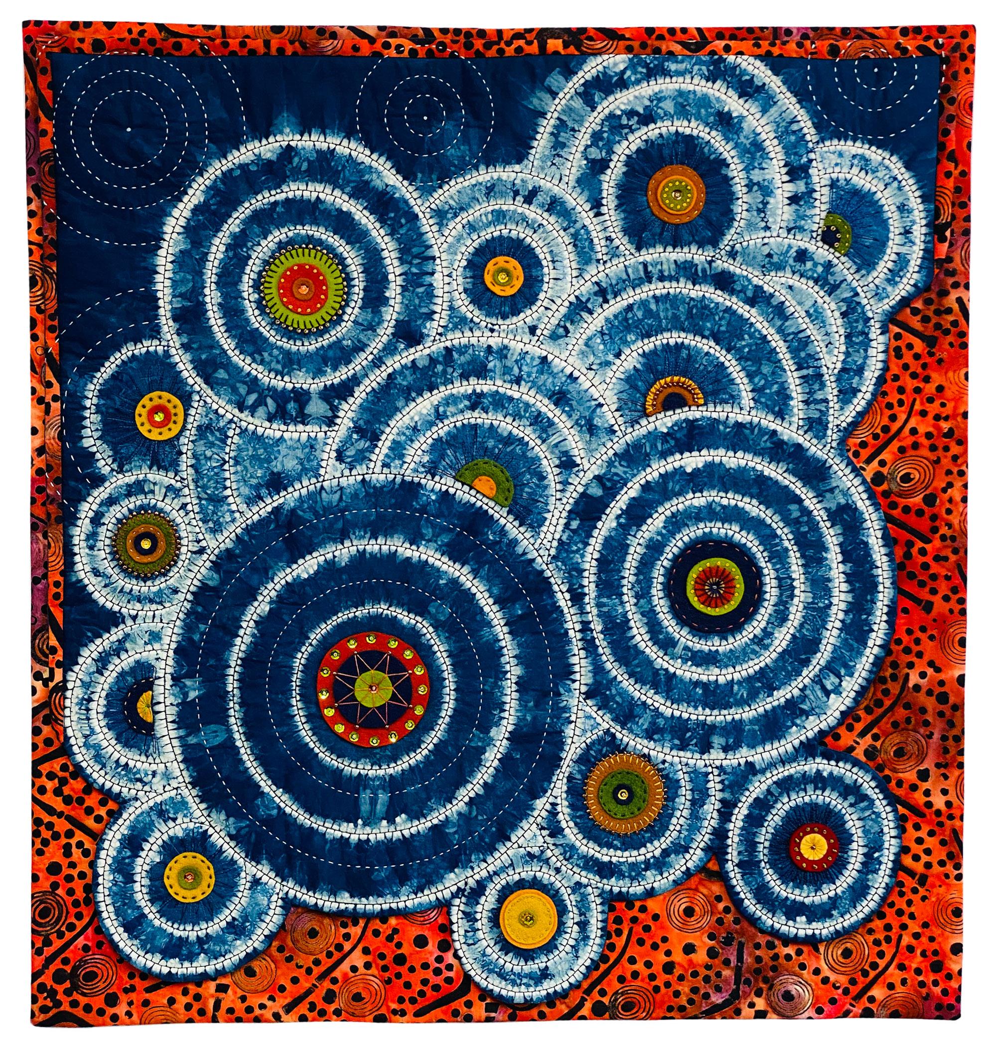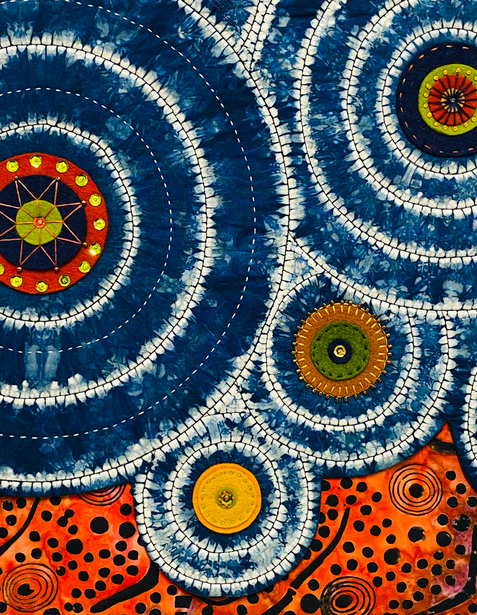 Indigo dyed cotton fabric, wool and acrylic felt, embroidery threads, cotton machine thread, beads and sequins, commercial fabric, and poly batting.