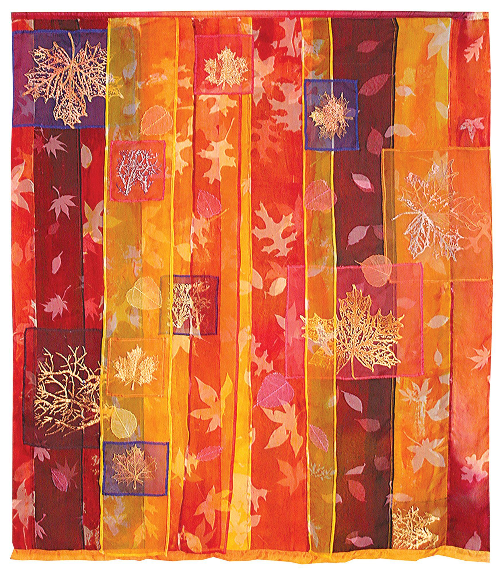 Habitat loss for trees and wild animals is an escalating problem in the ongoing urban sprawl of Washington, D.C. into Northern Virginia where I live. The woods surrounding my house offer sanctuary for me and many creatures. Fall foliage provided both inspiration for the imagery and the leaves for printing this quilt.