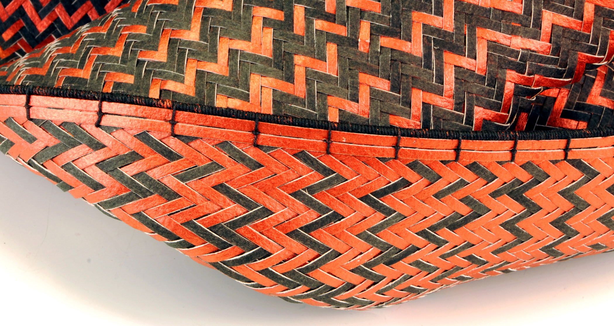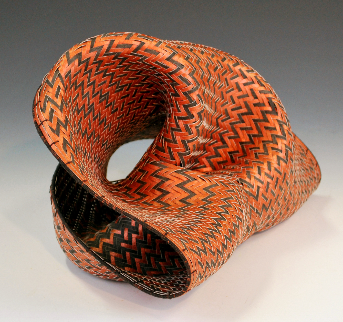Variations on a Theme 4 is part of a series in which each basket is created in the same way, only with increasing numbers of weavers with each iteration. The piece was constructed using five starts woven together in diagonal twill.