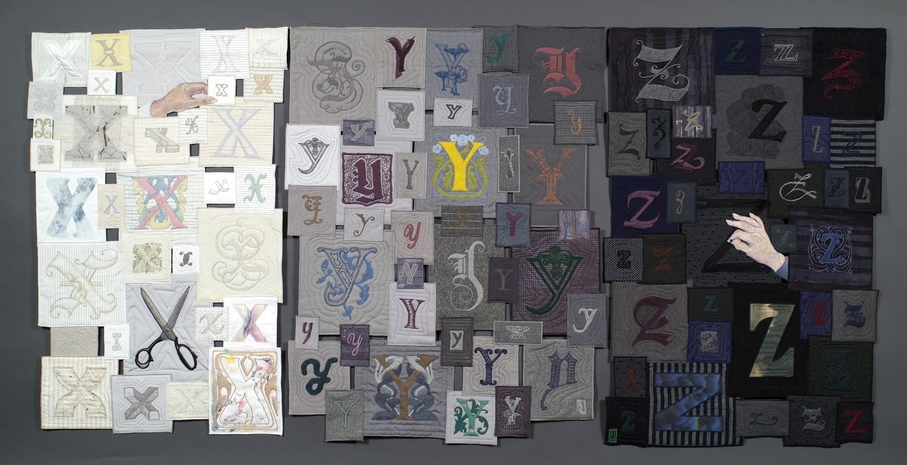 This triptych is part of my continuing series of Alphabet quilts. To make each letter in this alphabet series quite different I decided to highlight these three letters individually, yet together as a triptych. There are two hands included. One is holding a tiny "X" quilt and the other is unzipping a zipper appliqued in a 'Z' form. For the center of interest, 'Y' is for 'yellow' becomes the highlight of an all gray background. There are approximately 100 tiny quilts, sewn individually and then stitched together .