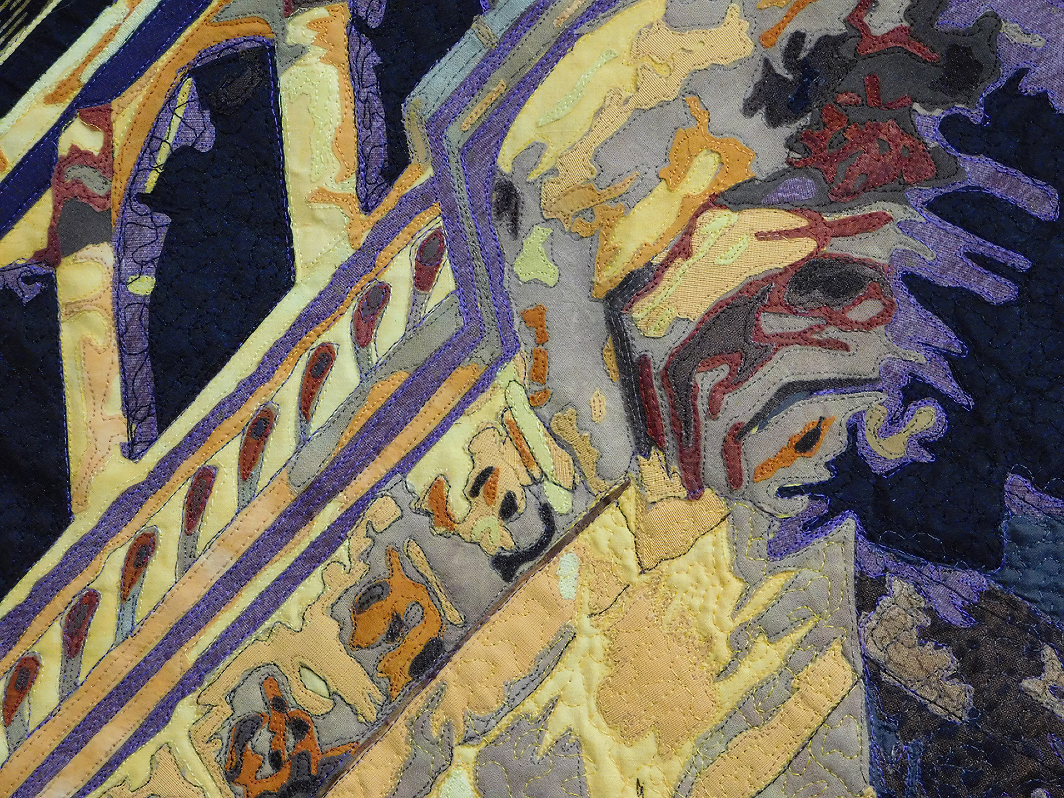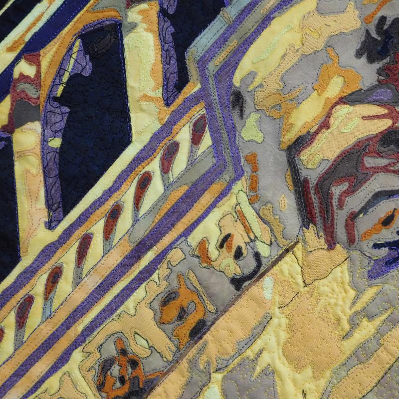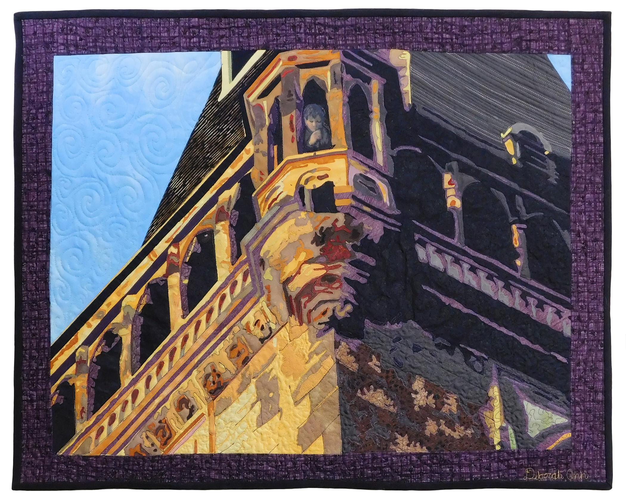 European architecture is so wonderfully intricate. The US is so young that we have nothing like that here. I took this picture in Germany when I was visiting my daughter, who lived there and knew I had to do it in fabric. Each shade of each color is a hand picked piece from my hand dyed fabric boxes. I loved the challenge of trying to replicate the crumbling stone. I was on the sidewalk and saw this little boy leaning out of the turret so he had to be included in the art quilt.