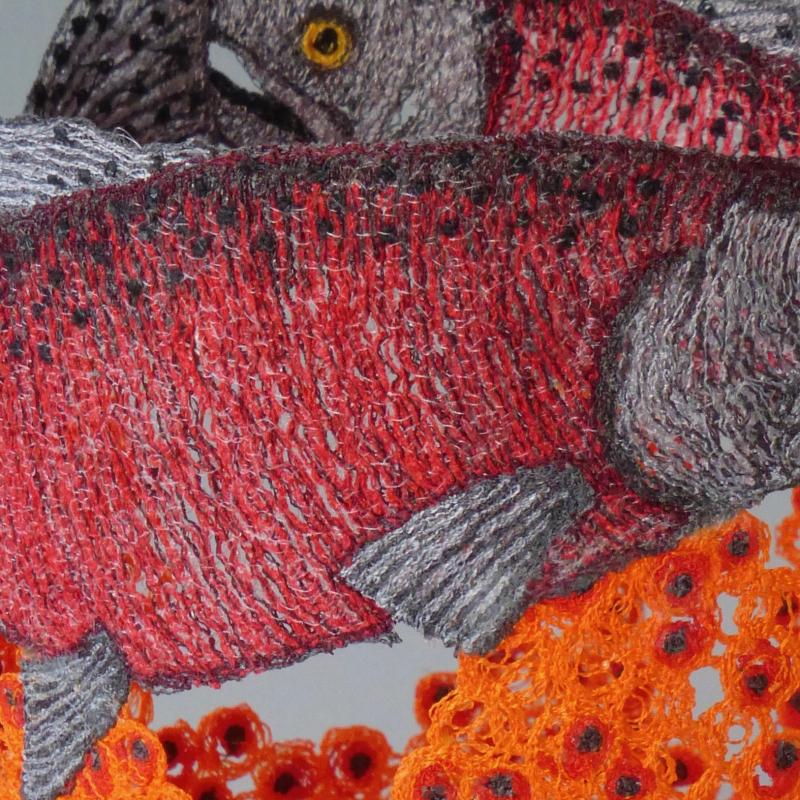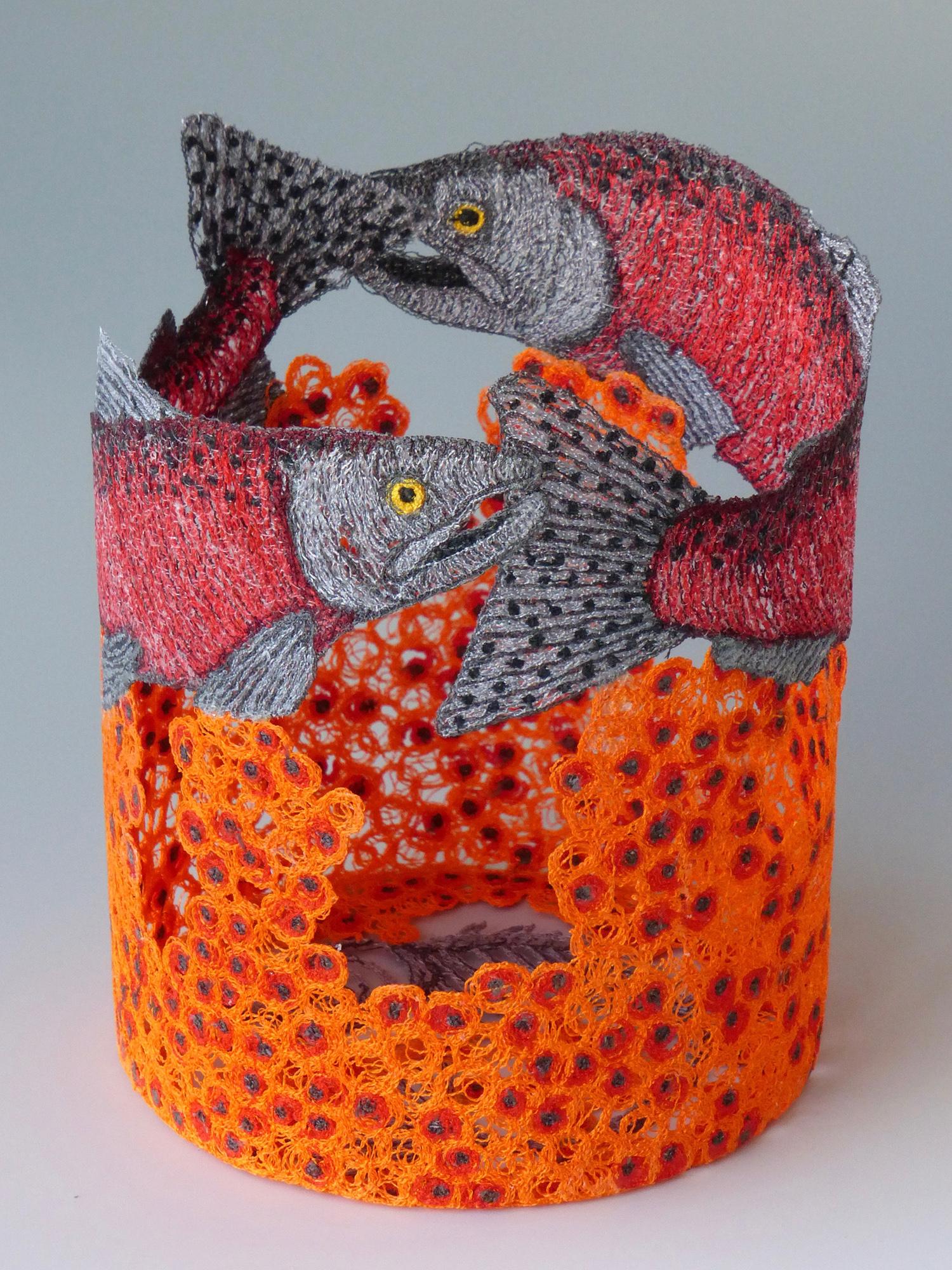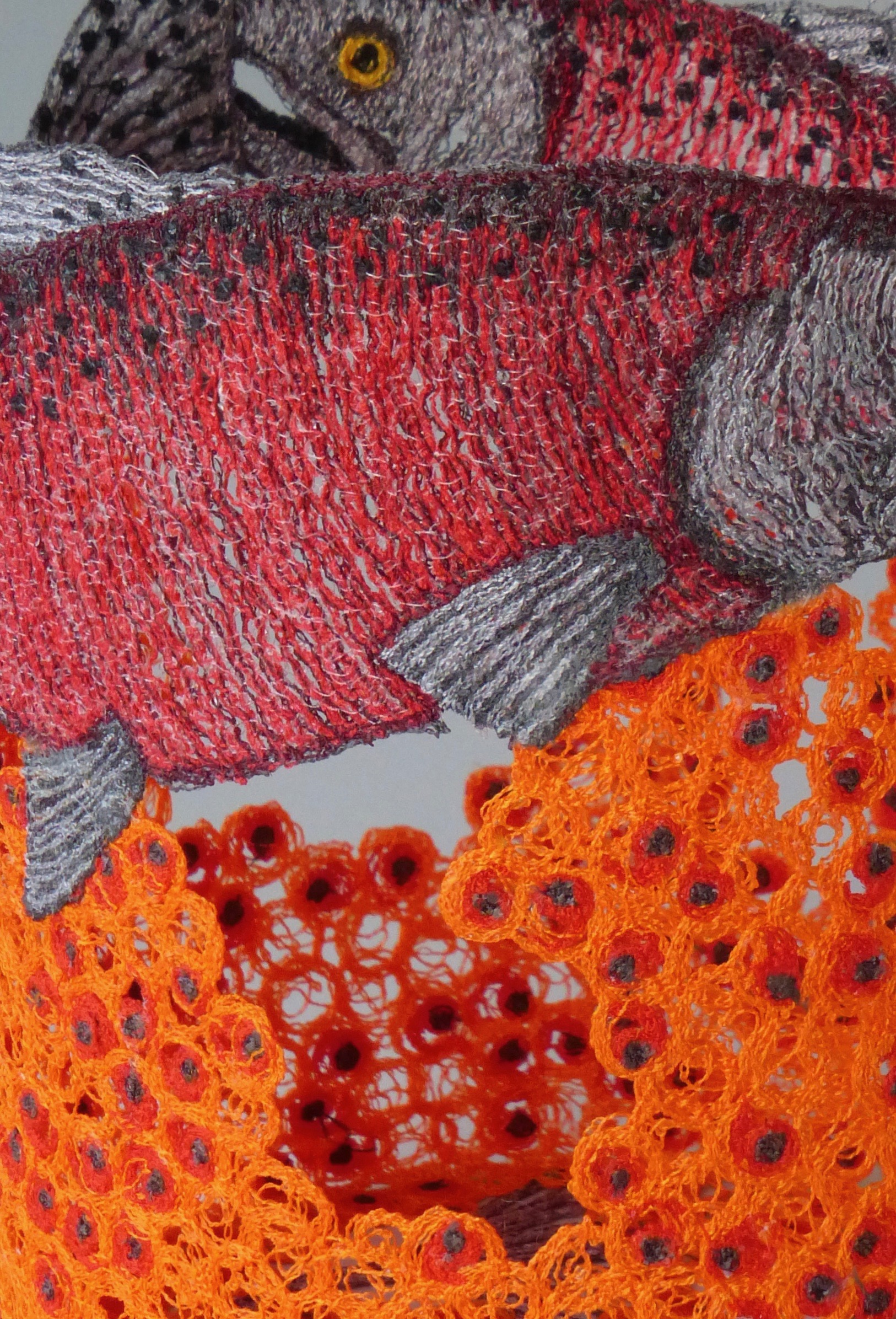 “Virtuous Circle” tells the story of Alaska’s most precious natural resource. For me, the salmon is a symbol of sacrifice and renewal. Adult salmon return to the rivers of their birth to create the next generation, swimming upstream in a long arduous struggle at the end of which they die. Their decomposing bodies release essential nutrients into the river, creating a nourishing environment for the next generation. In spring, the eggs hatch, and the young salmon travel down to the sea to begin the cycle again.