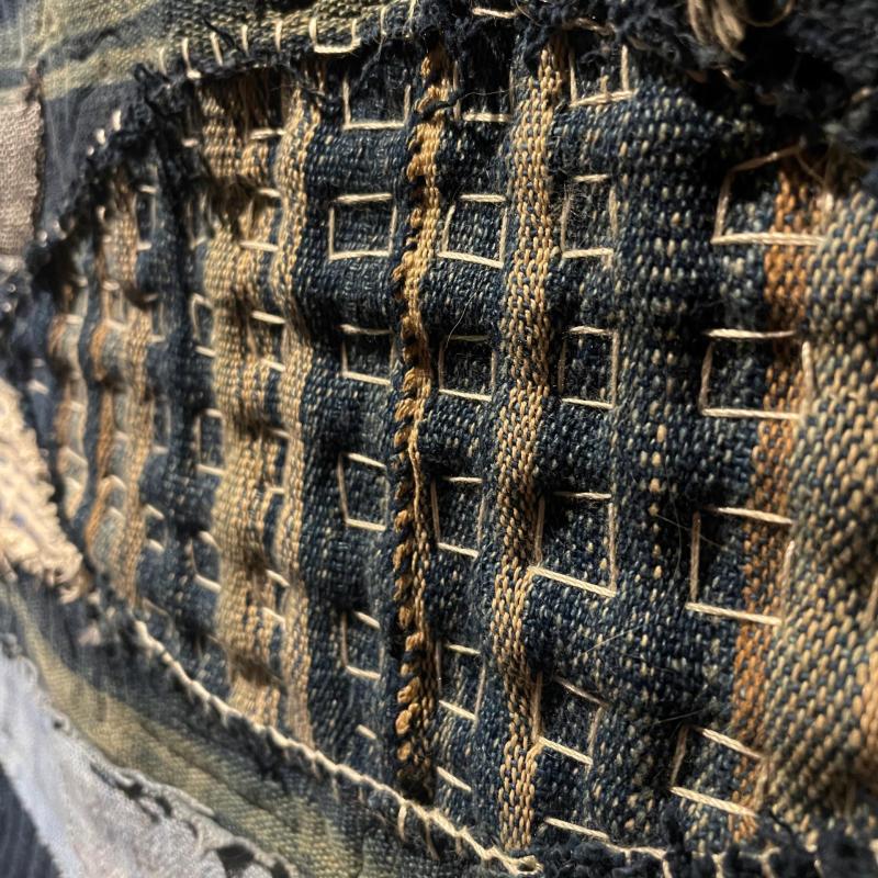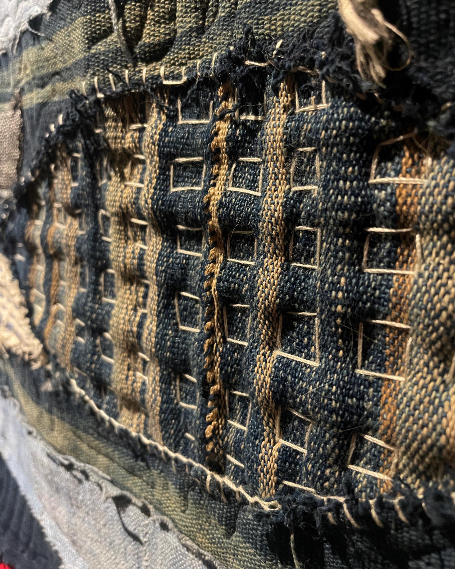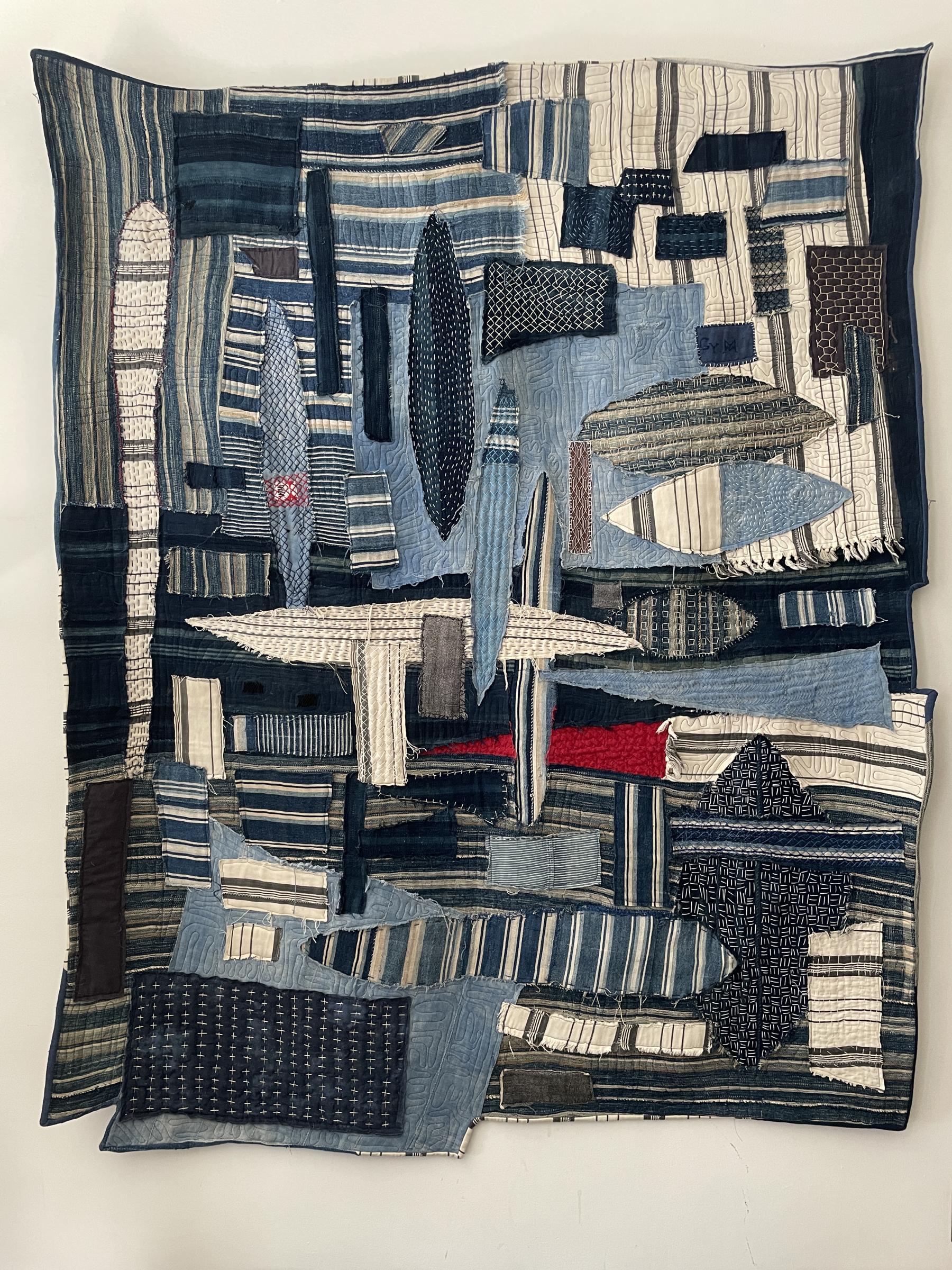 Visibly Mended captures a heartfelt journey through fabric and thread. Crafted from African shawls, each textile tells stories of resilience. This vibrant quilt, in blues, whites, blacks, and red, is a dialogue on repair and renewal, celebrating beauty in imperfections. Global stitching techniques symbolize human connection. The piece invites reflection on growth and healing, honoring the artistry of mending life's wear. It celebrates the human spirit, embracing flaws with love and intention.