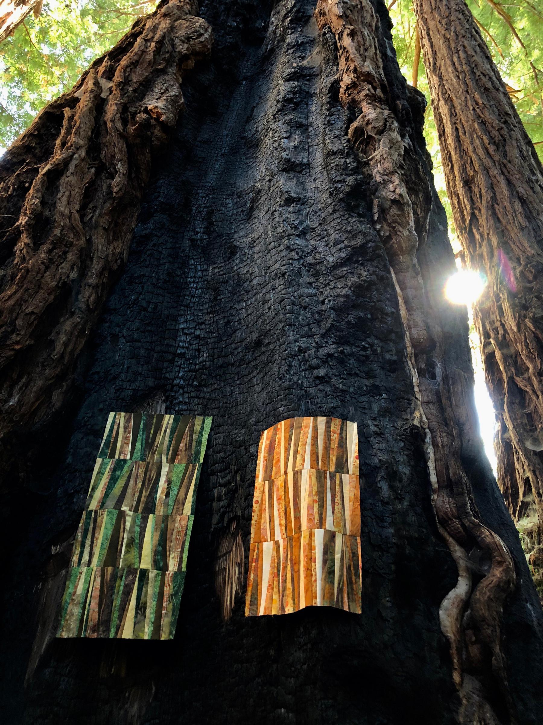 This redwood tree on private property in California is so tall I almost fell backwards in order to see its lush green top. Thriving, the tree bears the dark, charcoal slash from a fire long ago. In a year when so much of the state was ablaze, the redwood gave me a bit of hope. And so I acknowledged, celebrated and decorated the fire scar, with the dream that I can be as resilient.
