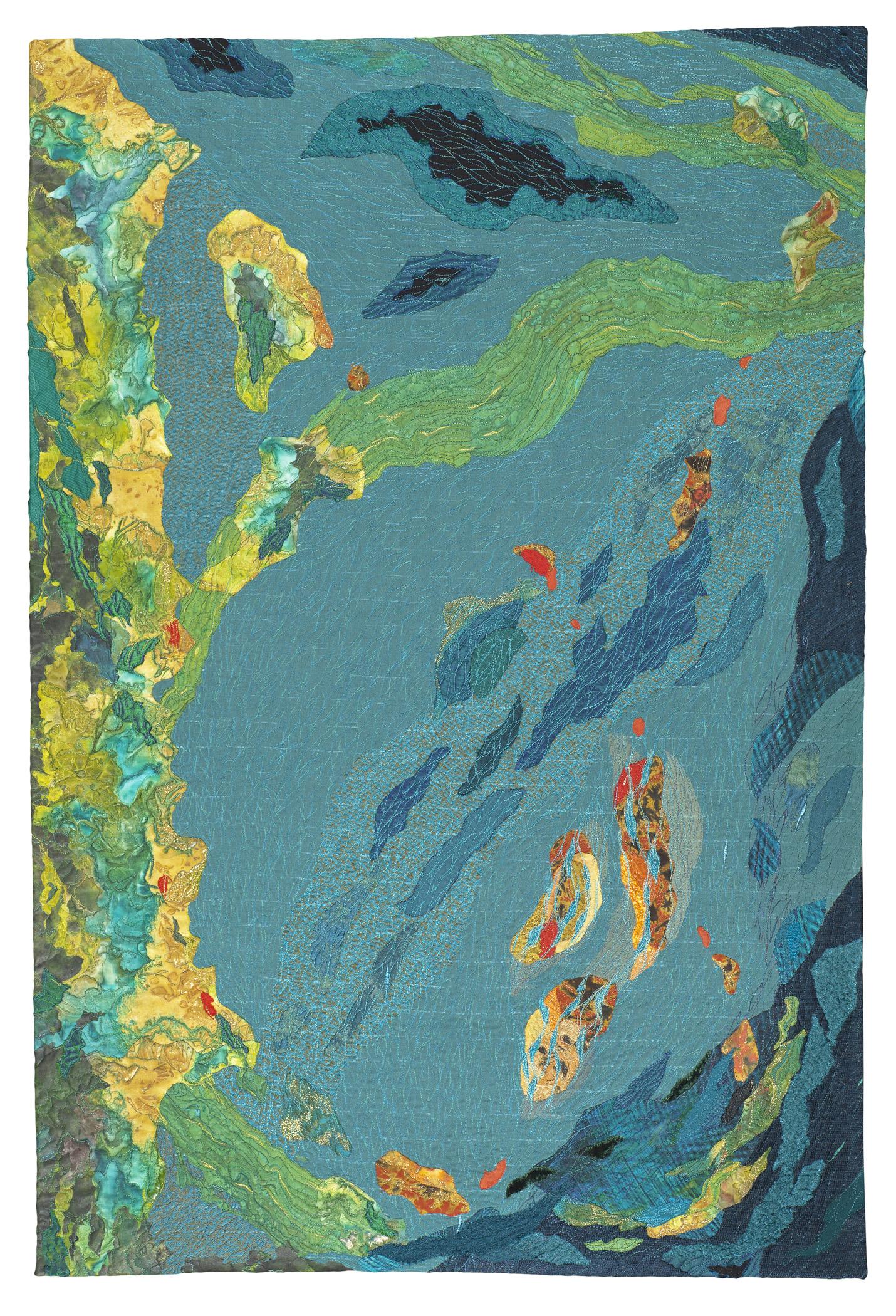 I paint with fabric and thread. Inspired by aerial photographs of land and water, Vortex II is one of a series of abstract landscapes created using free-hand cut organic shapes from different colors and textures of fabrics, then layered and stitched to recreate the interaction of light and depth at the boundary between ocean and the shore.