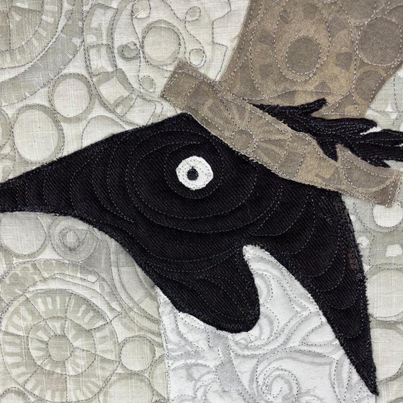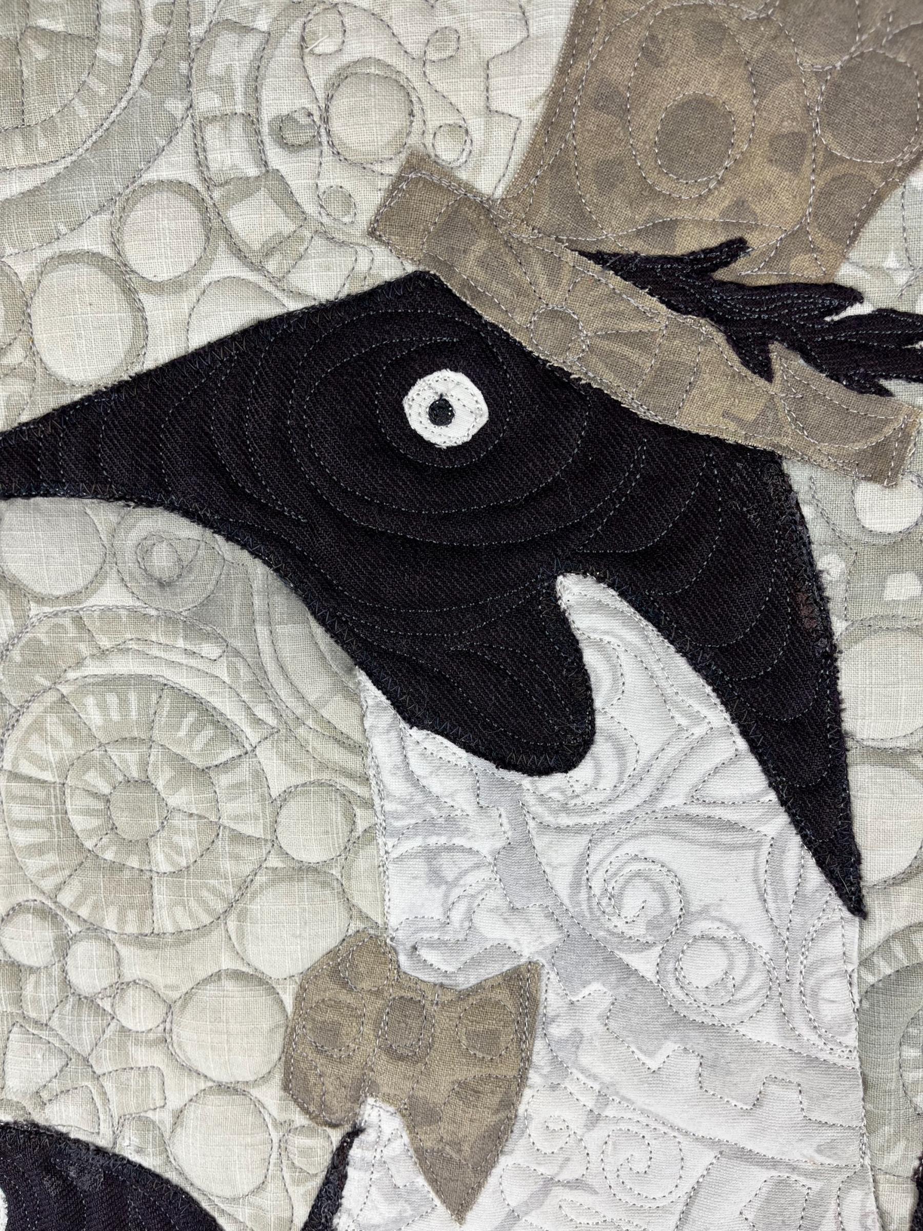 Raw edge appliquéd, botanically dyed, Thermofax screen printed, long arm quilted