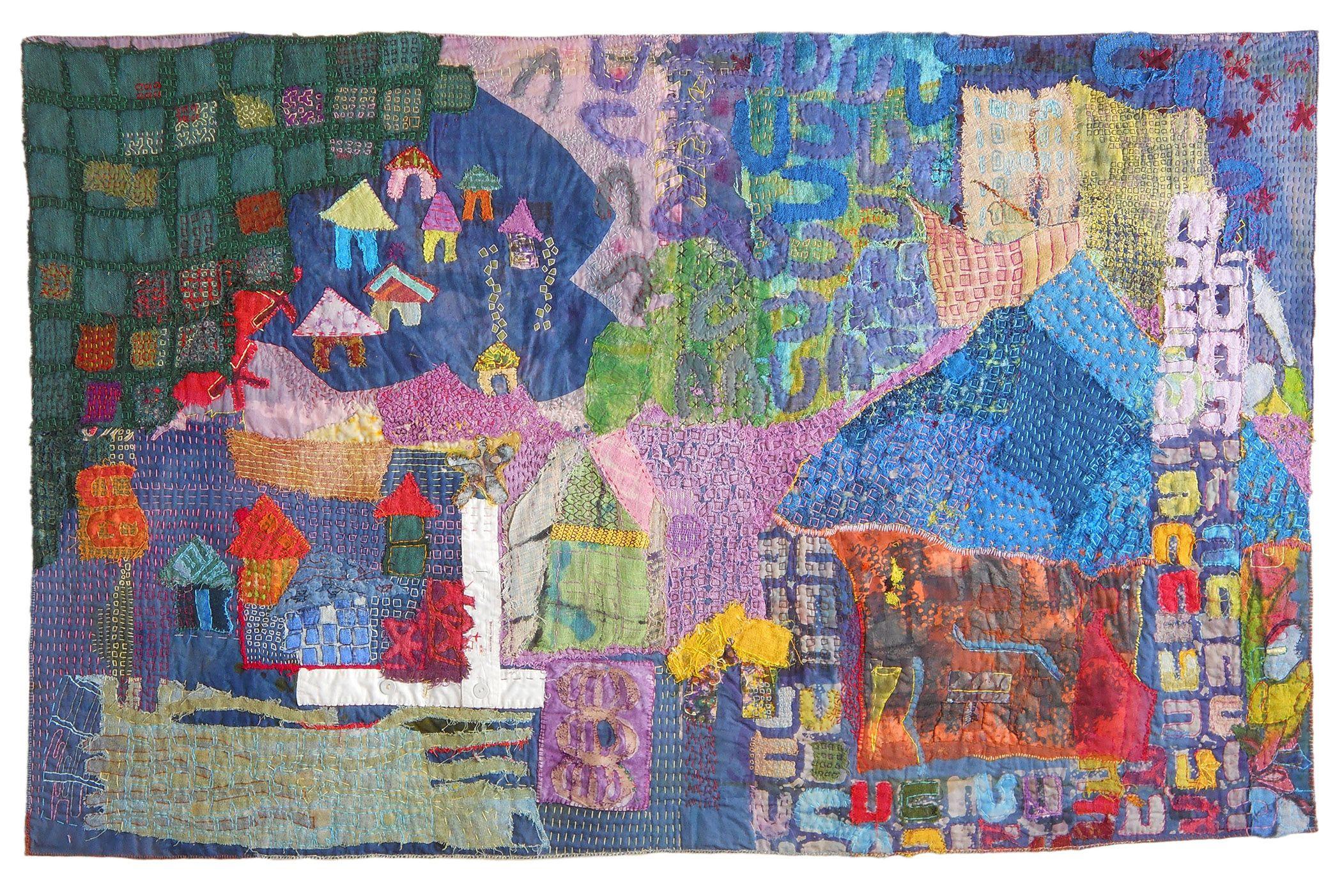 Waking Up is an exploration of how seemingly disparate parts come together and somehow make sense. The pieces are sewn onto a background one by one, encouraged to interact with one another. The stitching acts to blend shapes and colors as well as to hold all the pieces together. I like the way these heavily-stitched pieces feel in my arms when they are finished.