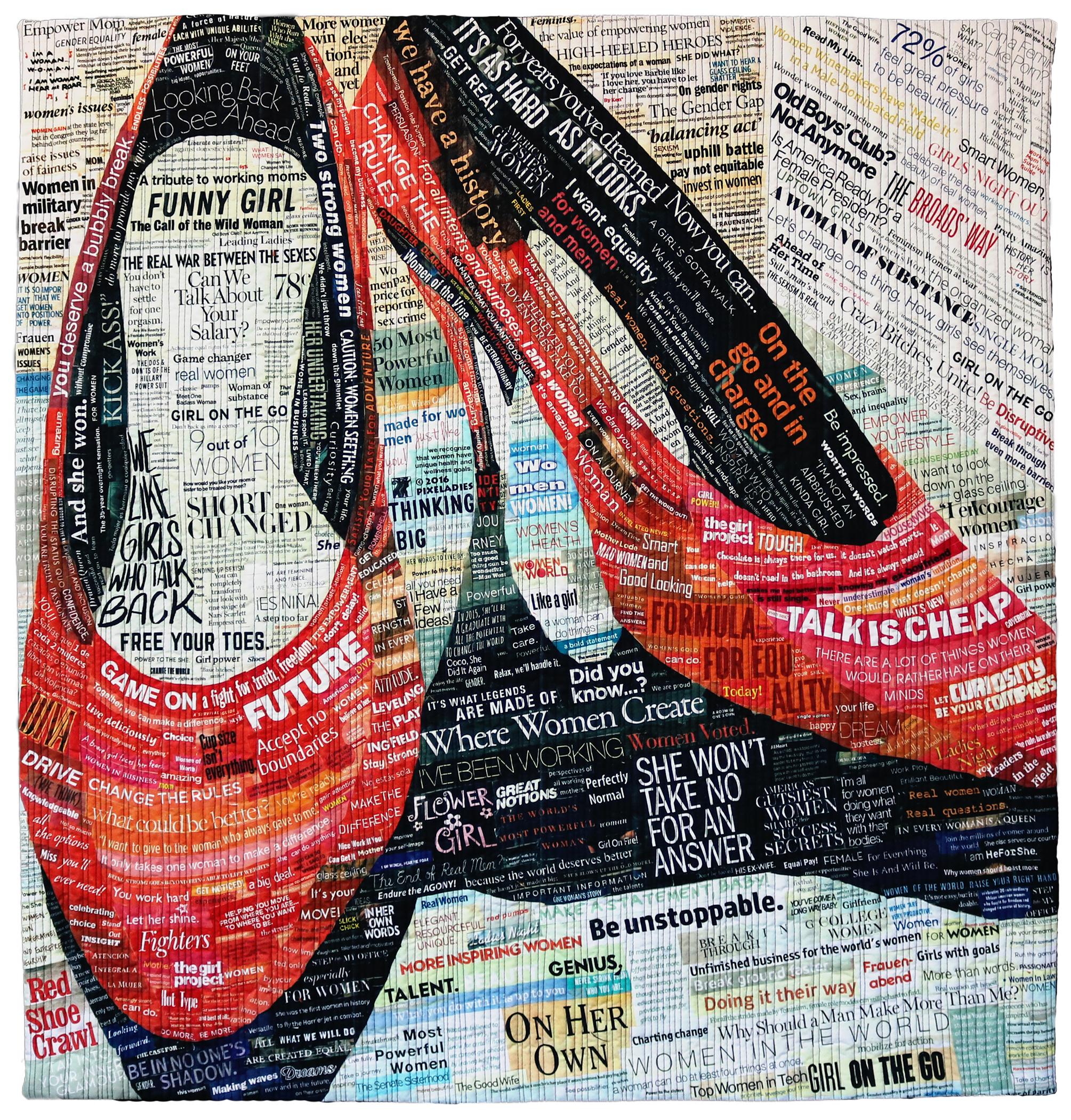 This piece explores gender inequality using the quintessential fashion statement: red pumps. The Pixeladies collaborate on their text pieces, using words and phrases cut from newspapers and magazines to form everyday objects. They like the serendipity of finding random phrases and then putting them together to create new meaning.