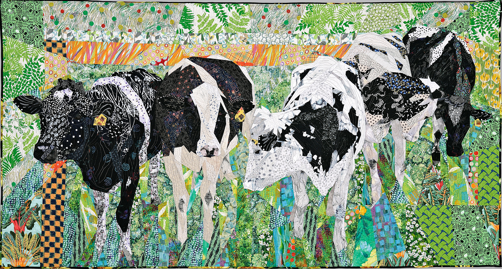 I love where I live high in the hills of rural New England. A local dairy farmer keeps 5 or 6 Holstein heifers in a green pasture next door from May to October. They grow up to act like teenagers over the summer. It has been said that my animal quilts have a life to them, very different from the static look of photographs.