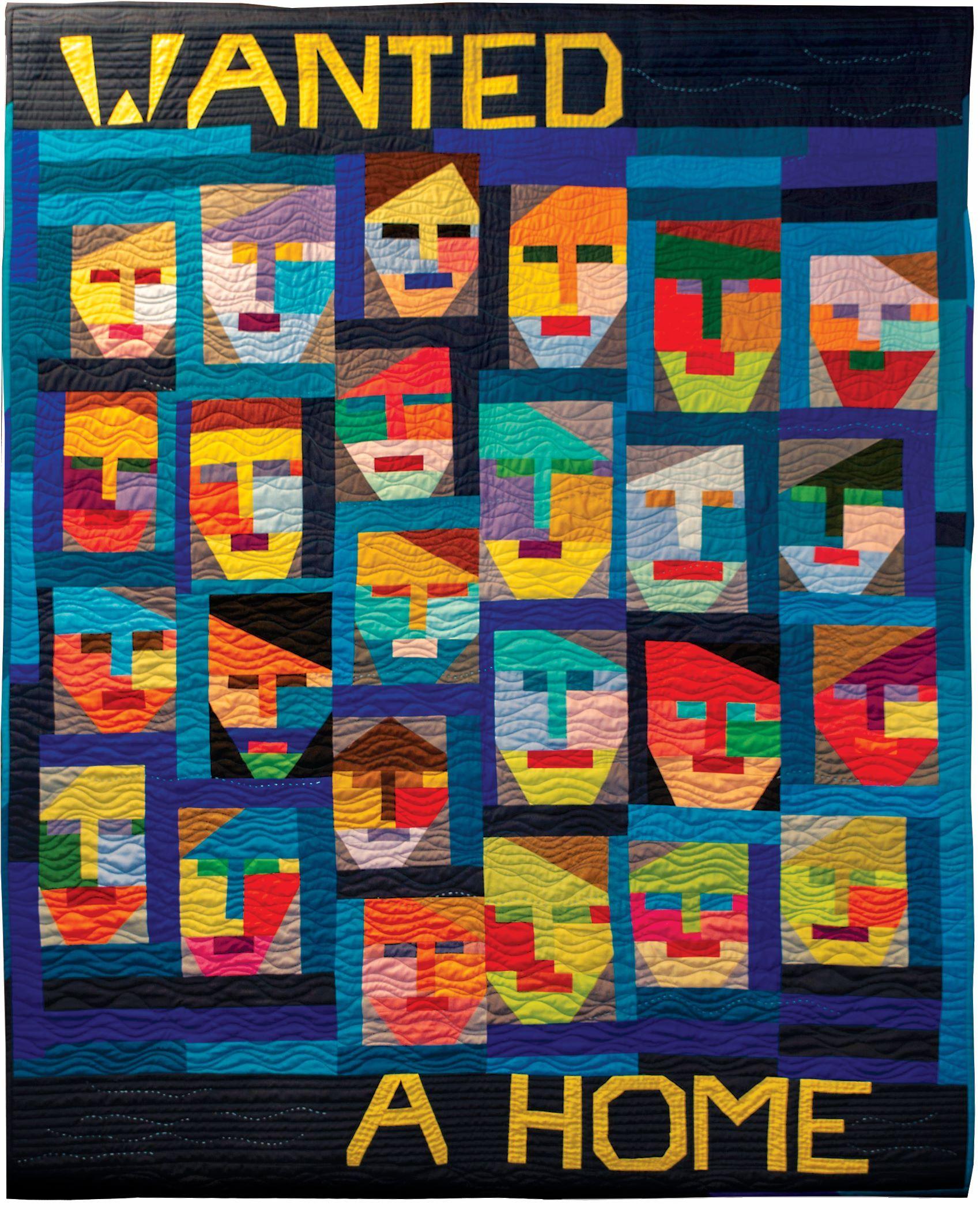 This quilt, with its improvisational faces floating in a sea of blues, is a reminder of this humanitarian crisis. Throughout history, people have taken perilous voyages over rough seas seeking asylum. Currently people are crossing the Rio Grand River and the Mediterranean Sea, once again facing life-threatening hazards in search of a home.