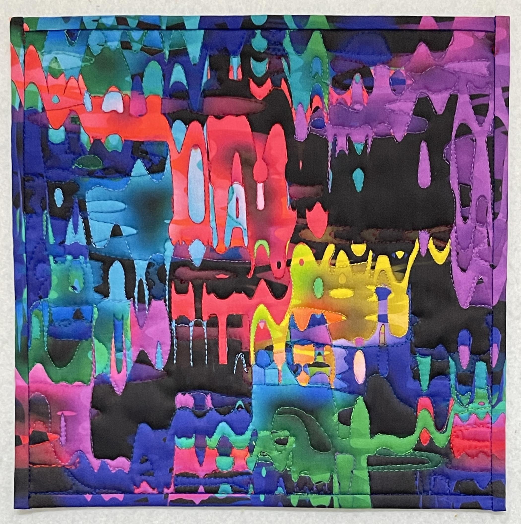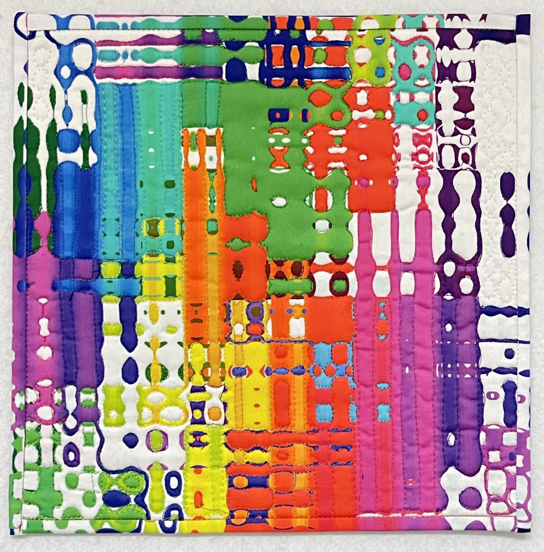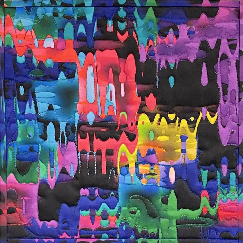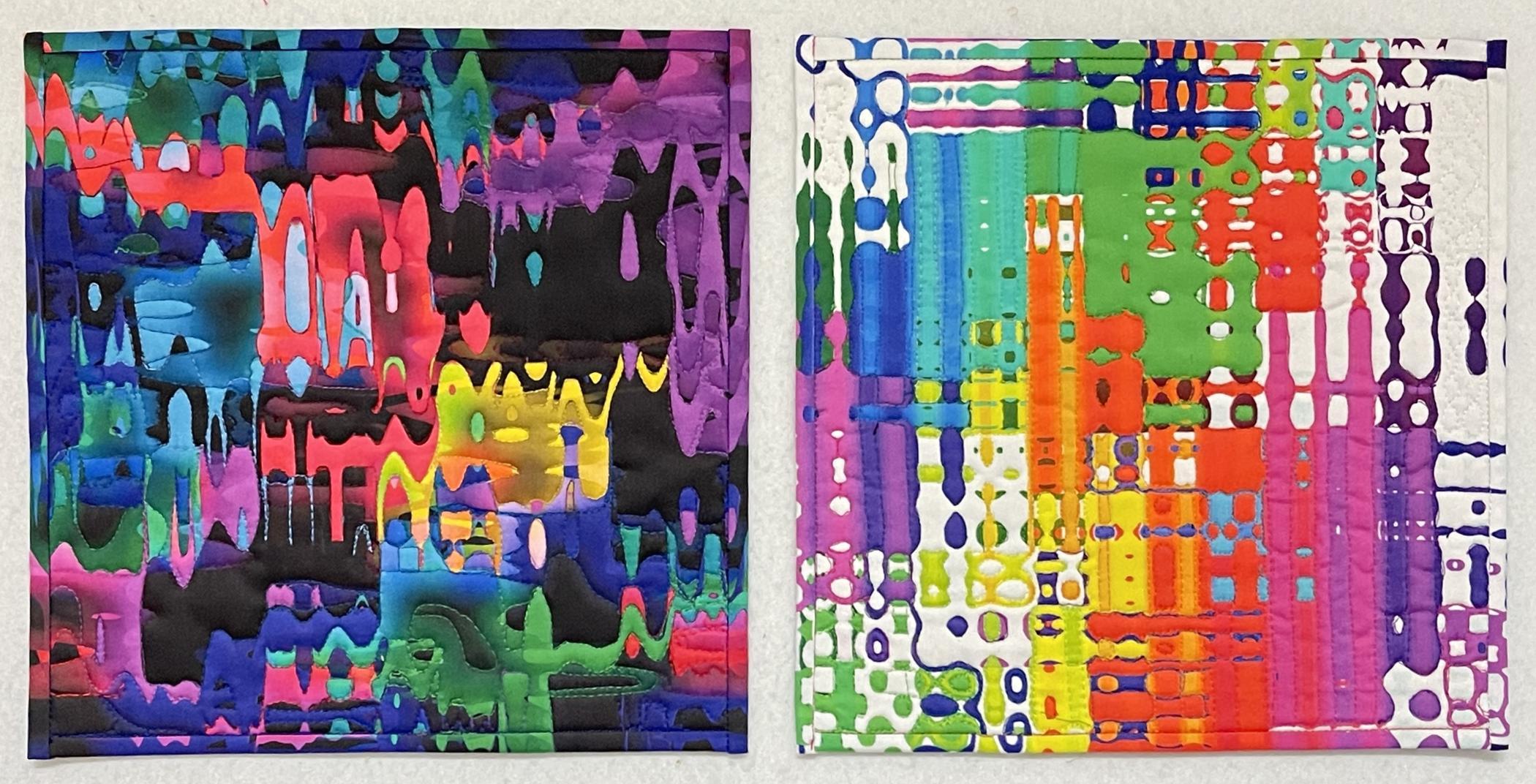 Original iPad ‘paintings’ by the artist, modified through a number of digital apps. Final designs printed on fabric, then layered and machine quilted.