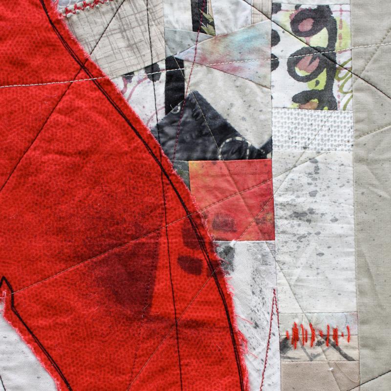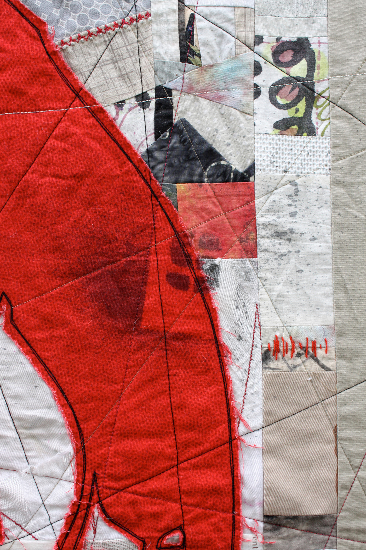Street art often comes from a desire of those without voices visual shouting to be heard, to be seen. War Sucks is a similarly primal scream. War wreaks havoc for the combatants themselves, but also for their families, their communities, and entire countries and economies. The cutting and mending, and raw edges of the quilt (which includes uniform fabric and is backed with an old army blanket) reflect the destruction of warfare and shattered pieces even when it seeks to rebuild.