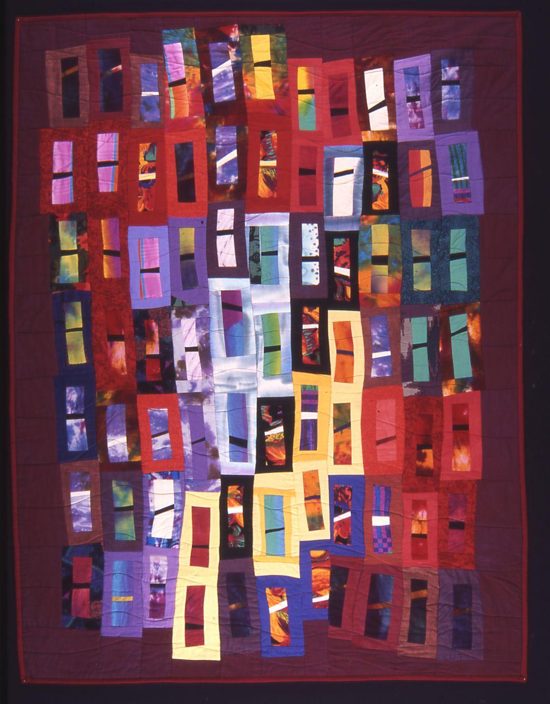 Much of Barton’s work references buildings, especially windows. She is a master at suggesting light. This piece glows because of the contrasting dark and light colors. The fairly minimal quilting is typical of this period. It ties the work together visually but plays a subsidiary role to the pieced top.