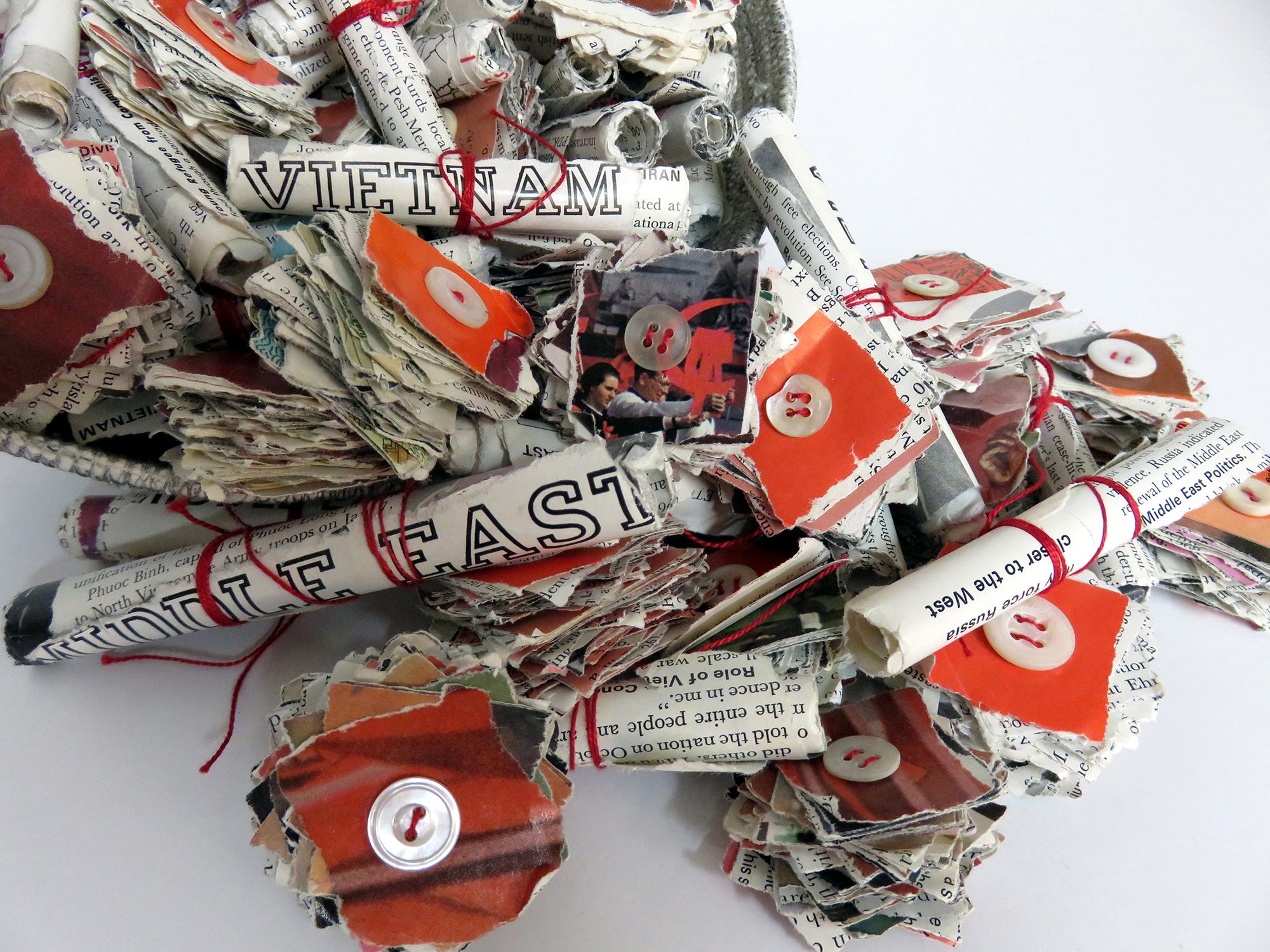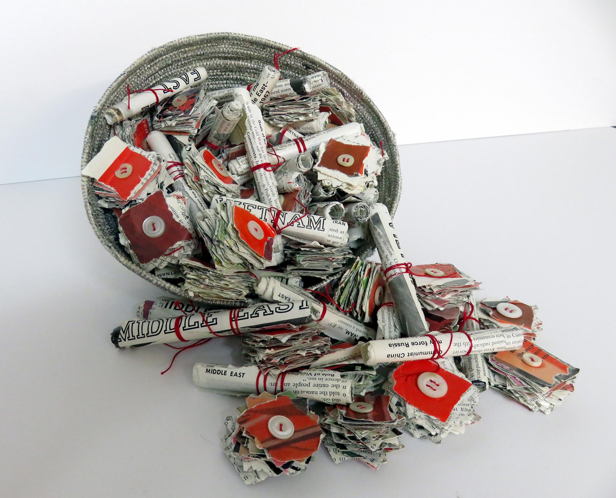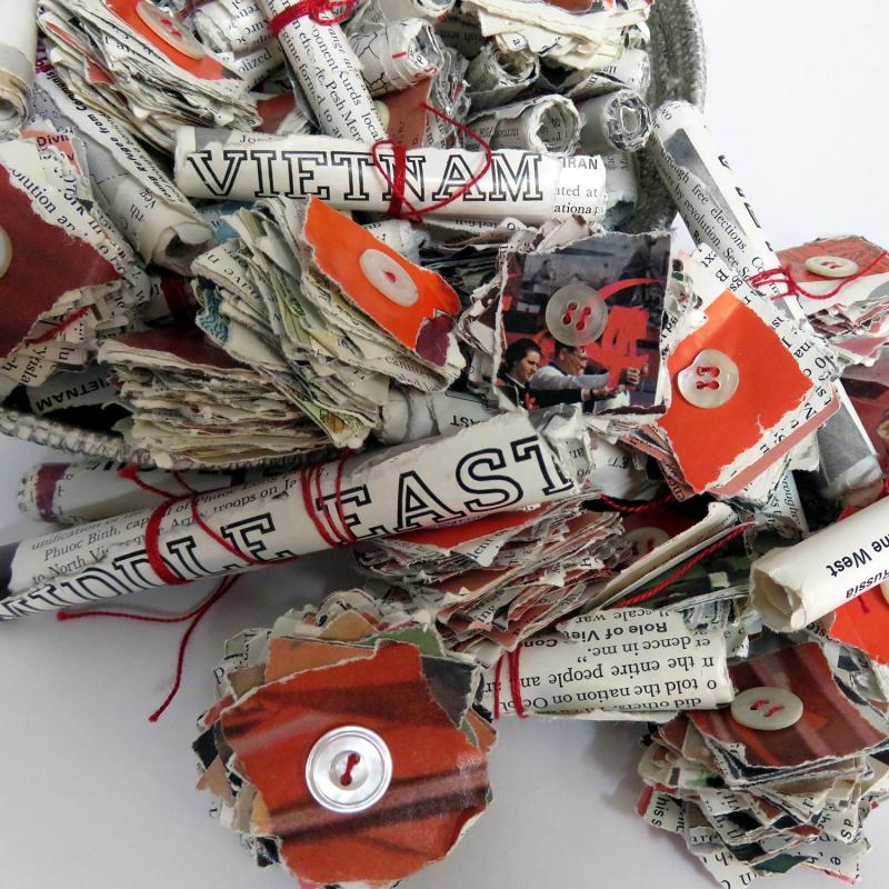 Machine corded yarn and zigzag stitched vessel construction. Contents: Layered and stitched ripped pages.