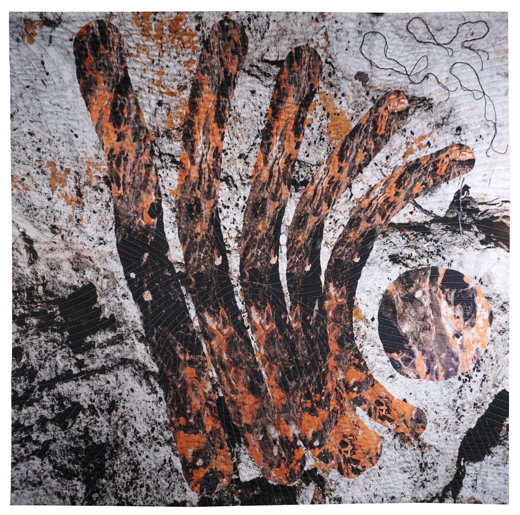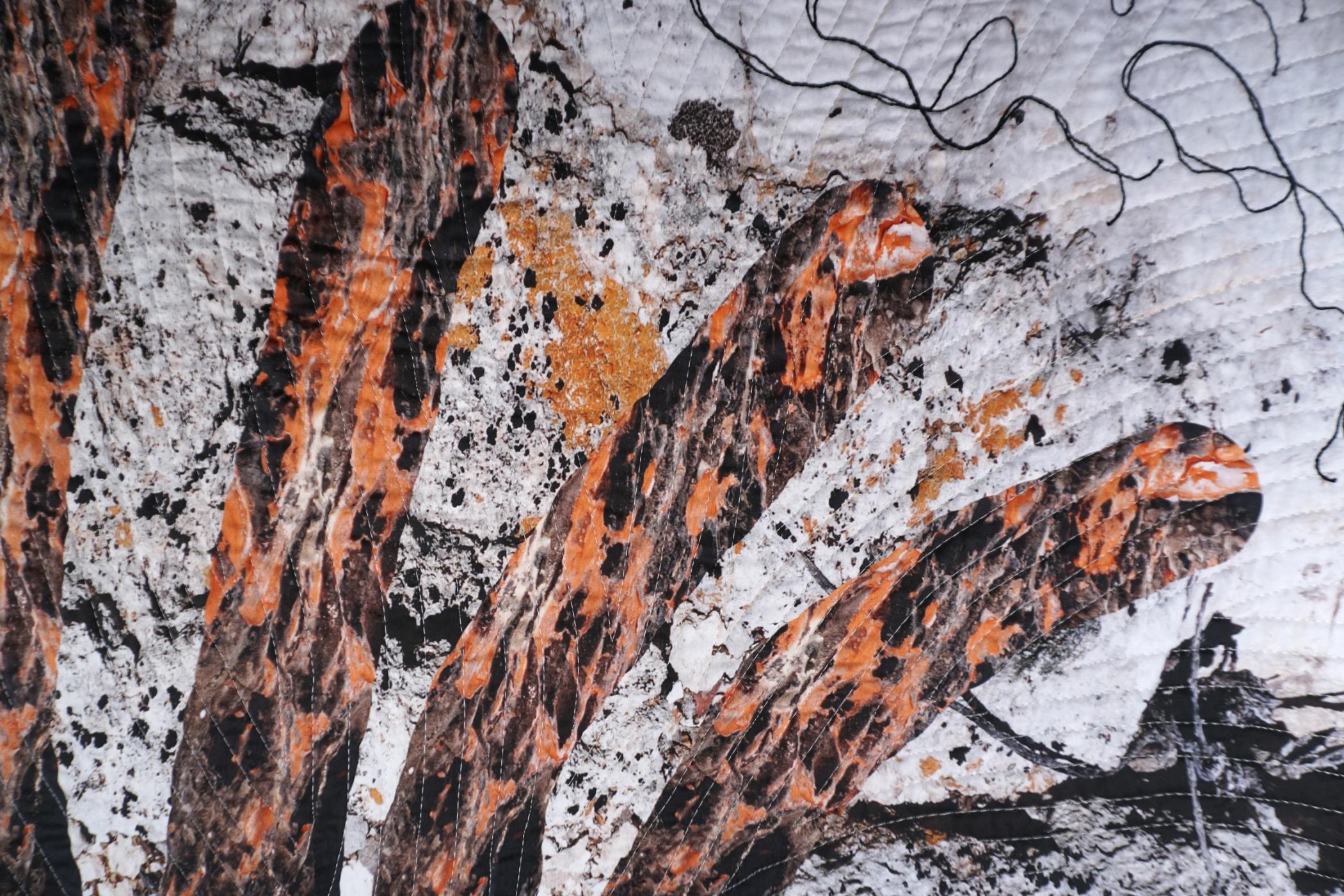 Digitally manipulated, printed, machine quilted, hand embroidered