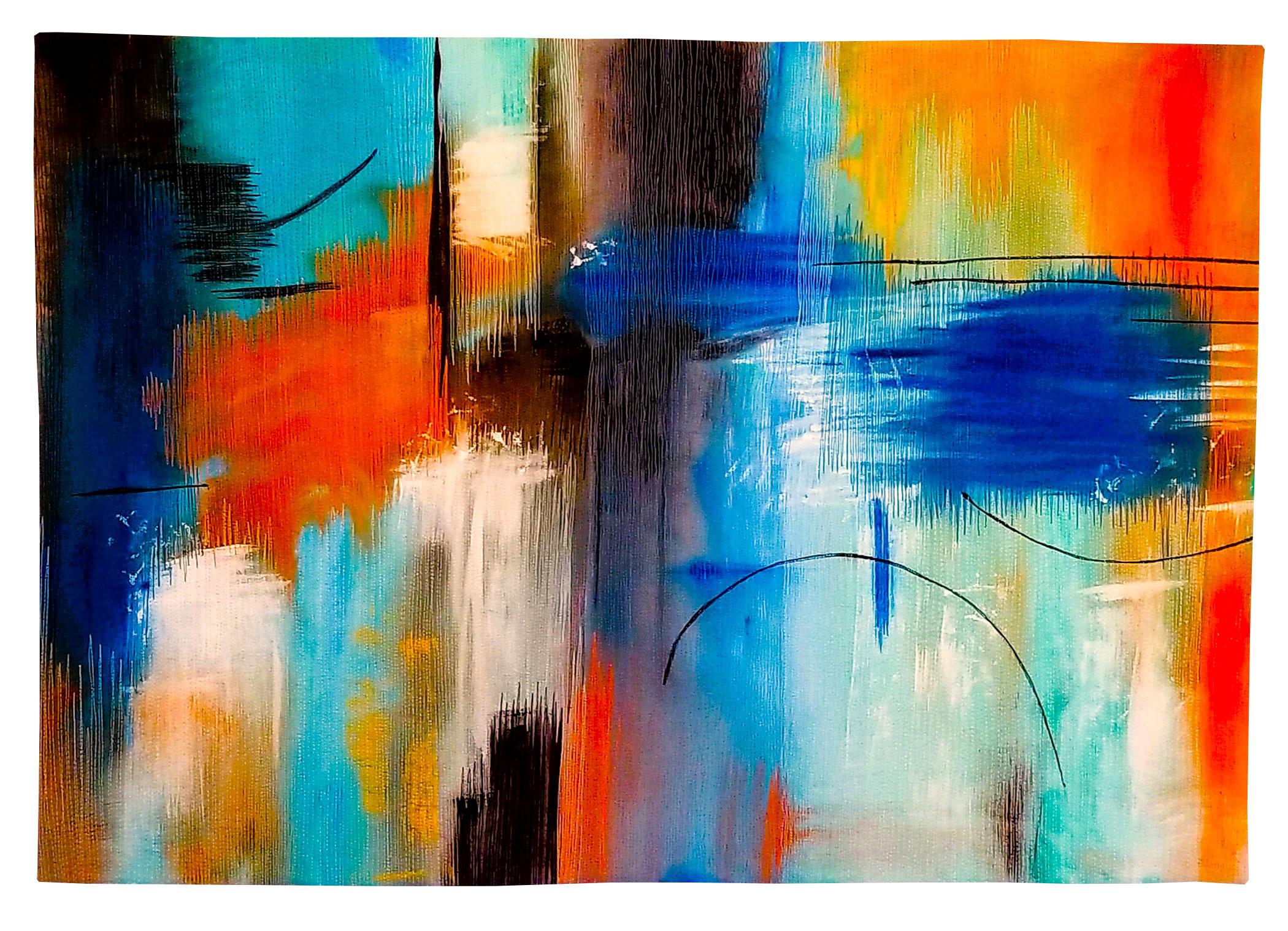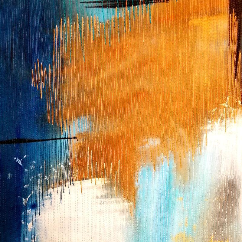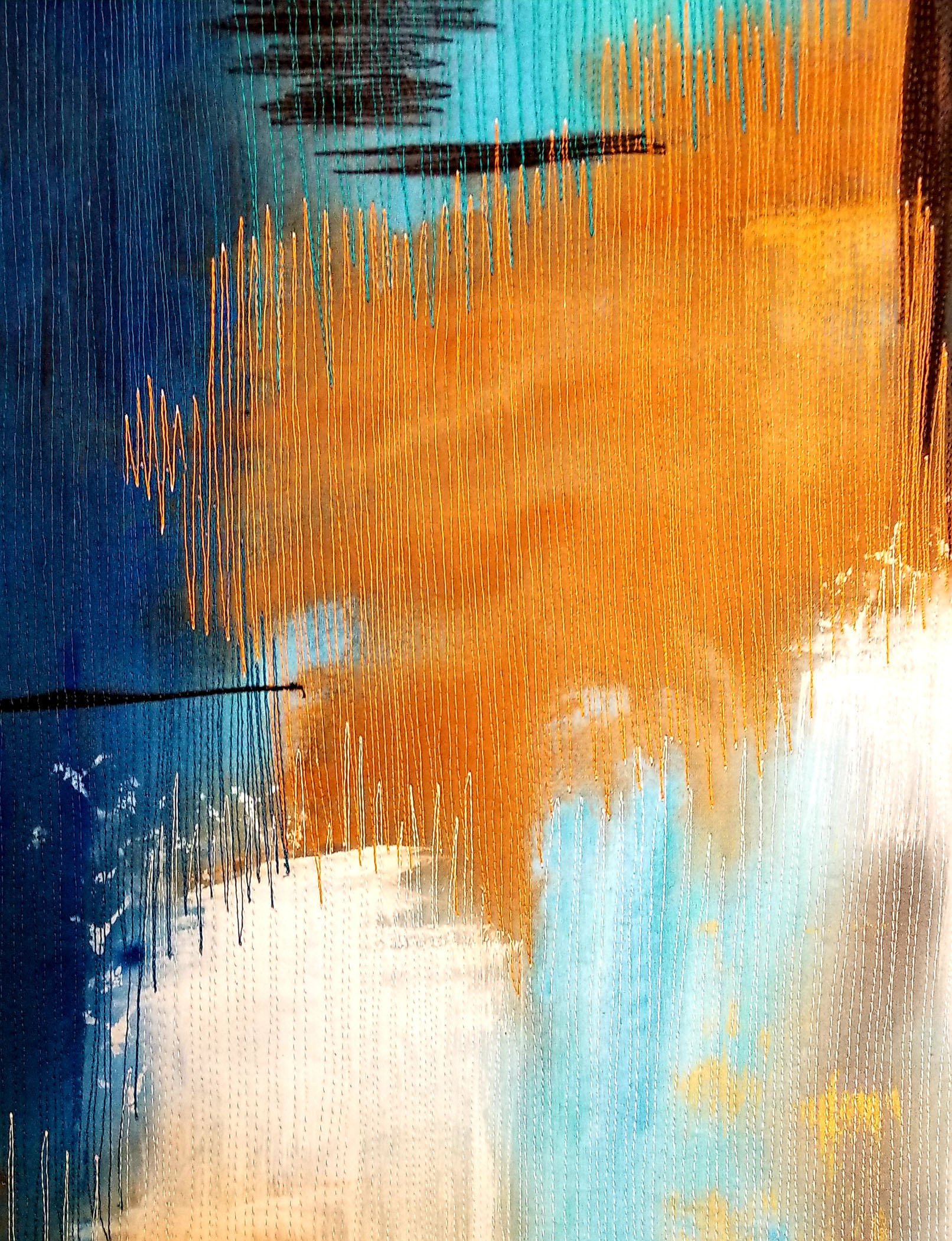 Water is an abstract, whole cloth painted piece. Lines, shapes, texture, and balance were important elements to create a cohesive, abstract piece of art. The black curvature lines were added along with some mono printing to give interest and movement.