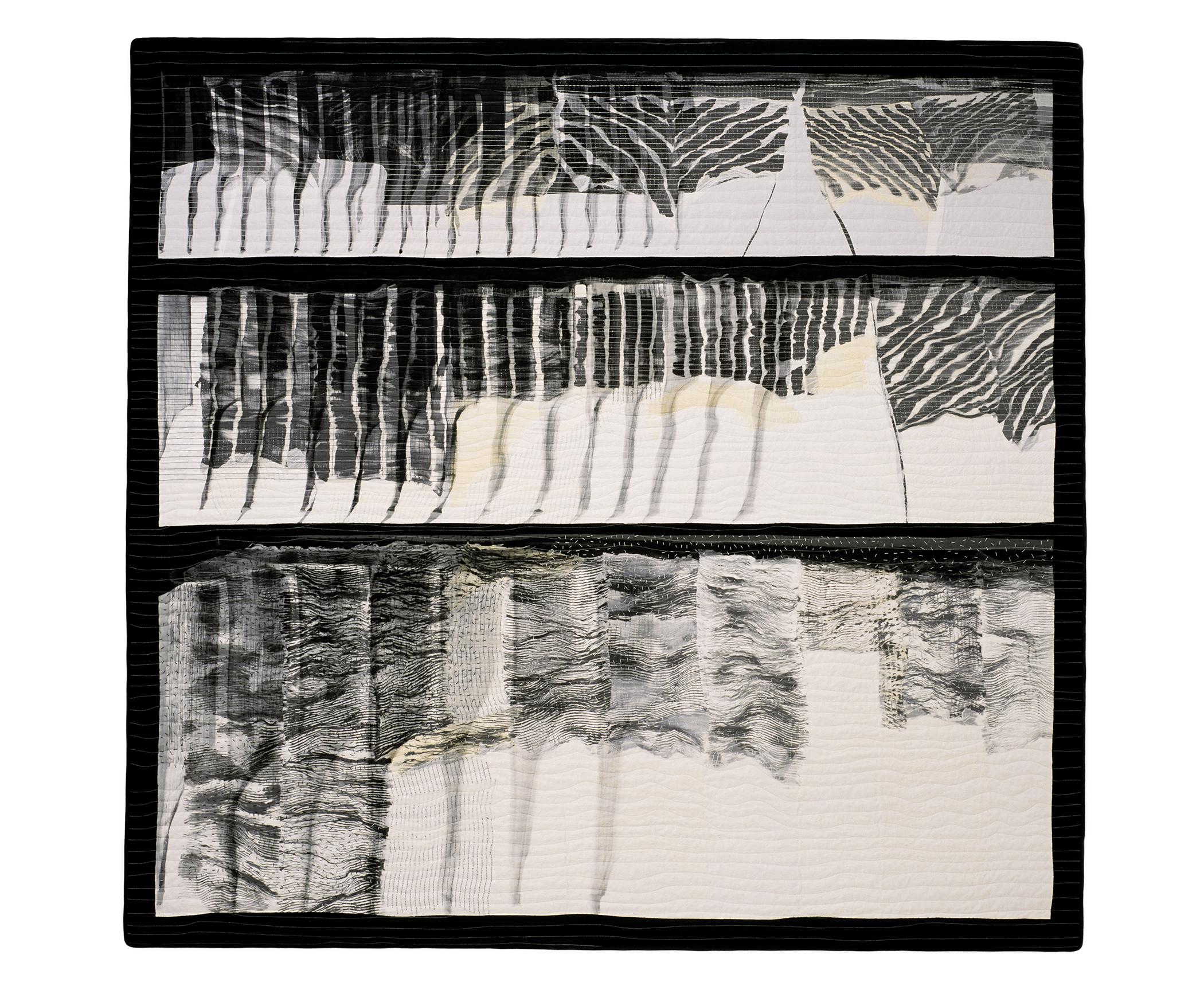 This work grew from a series of drawings and collage studies, of a beautiful waterfall in Up-State New York. The collaged, pleated and painted fabrics, relate to the flow and movement of the water, creating my own fabric landscape.