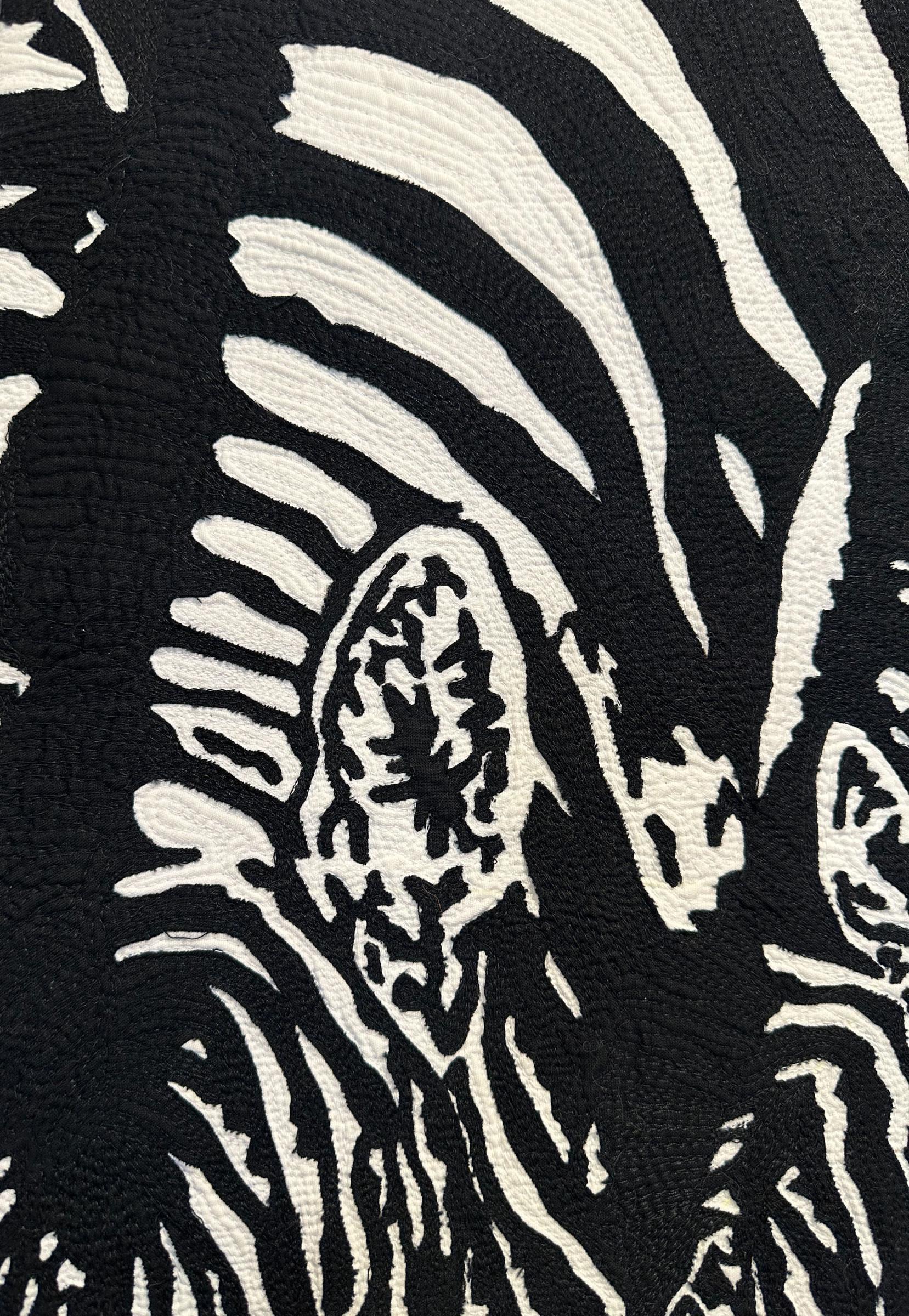 Camouflage is critical for zebras when they’re drinking at a waterhole. Their black and white stripes help them blend in with their surroundings, making it difficult to distinguish individual zebras from one another and harder for predators to single out a specific target. I wanted to challenge myself to use only black and white fabric to create this fiber art piece.