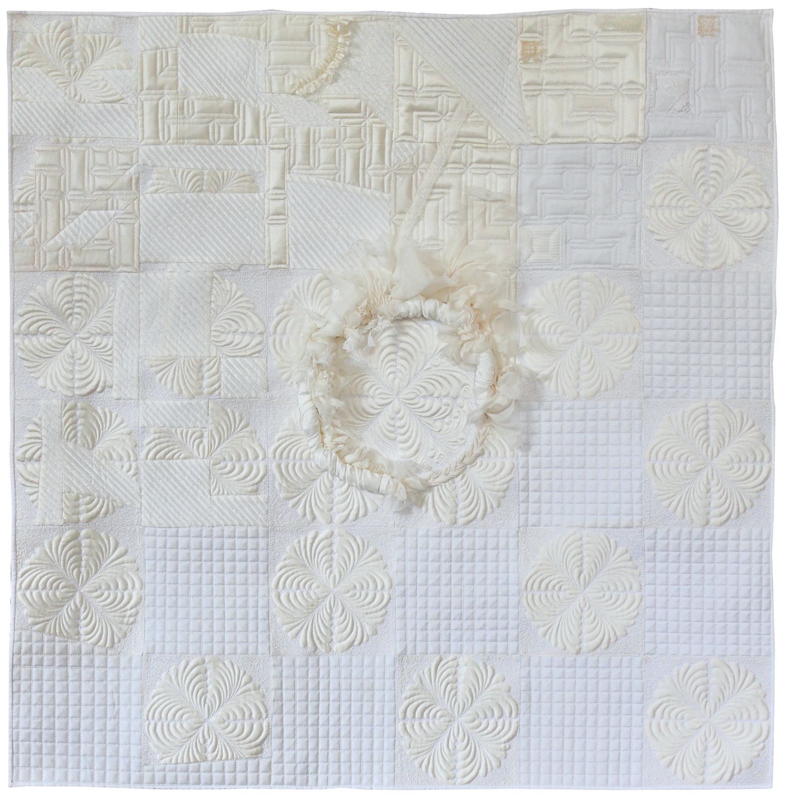 This piece is made from a cheap used wedding dress I found on e-bay. All the different fabrics on the wedding dress were used including the polyester lining. I work primarily in recycled fabrics and my aim is to show that discarded items can be made into very beautiful and delicate pieces that look nothing like their original form. I want to draw the viewer in closer to study the precise detail of the work and notice subtle differences between the fabrics used.