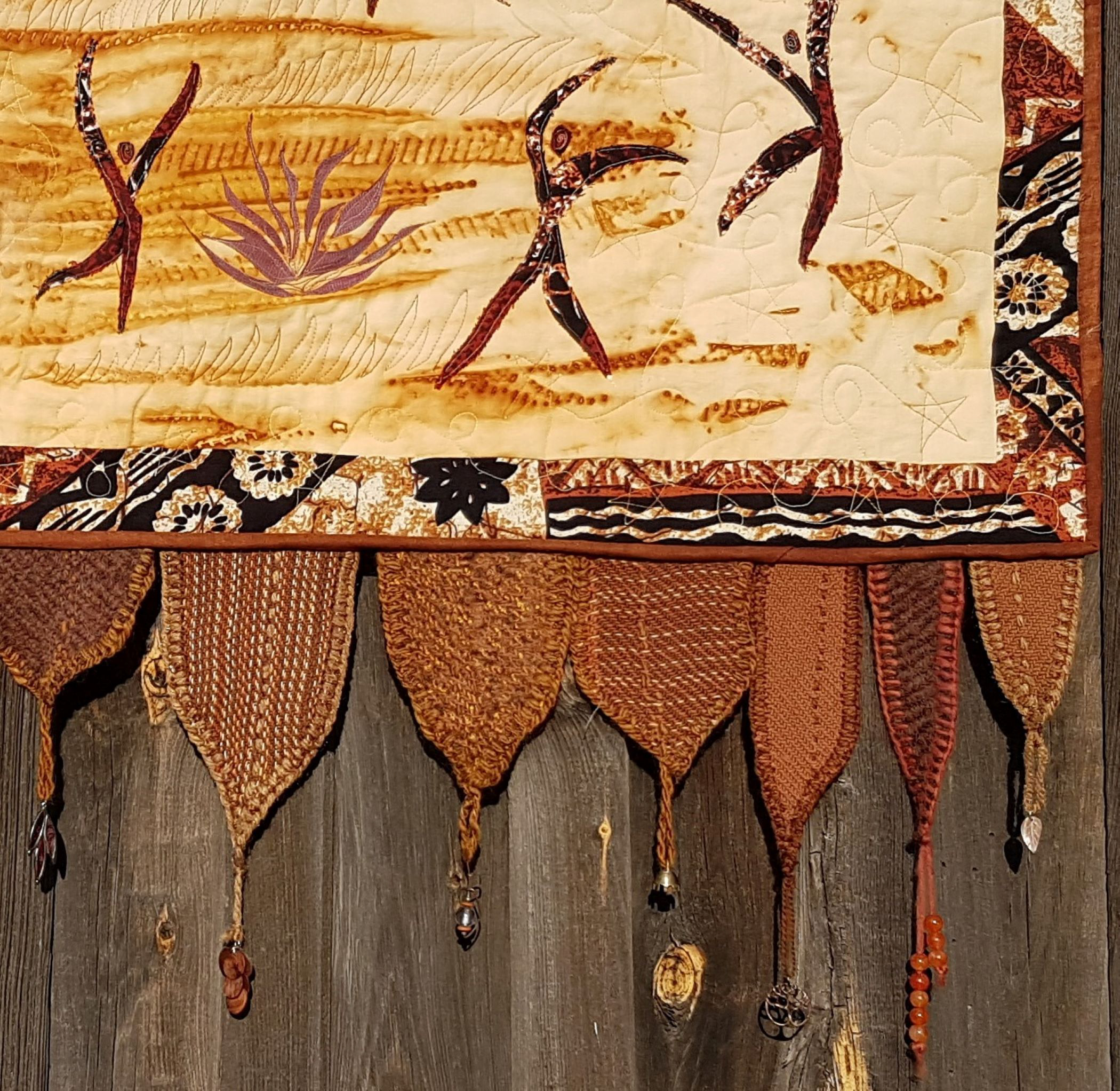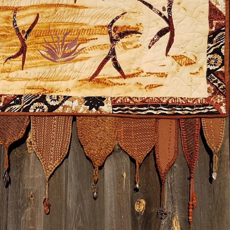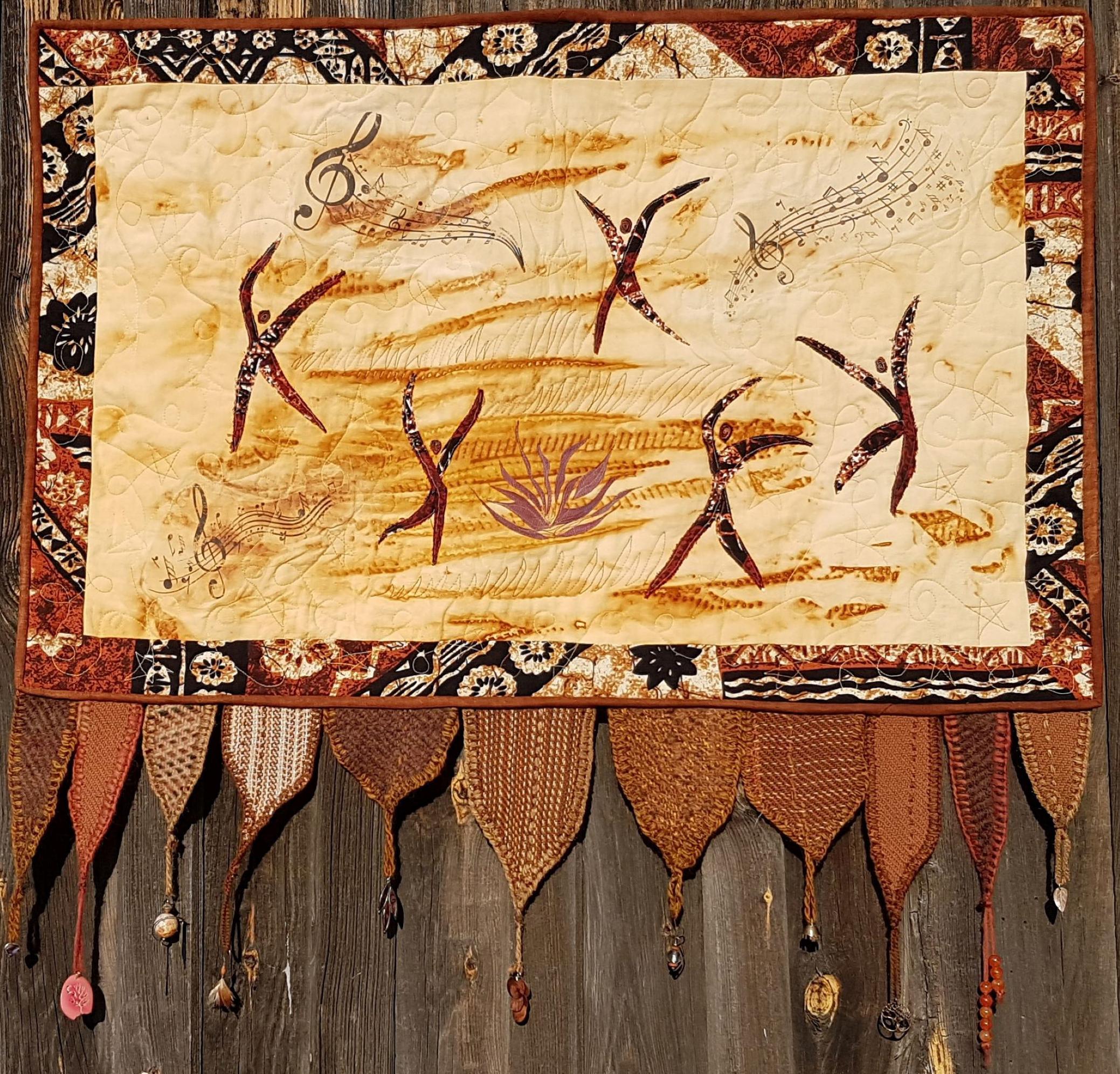 Music and dance has been present throughout my life, beginning with my parents Ukrainian carols and polkas, to singing and swaying with my friends at folk festivals. It is a legacy that has been passed onto my children, who both know the joy, solace, universal nature and connection these bring into our lives. My scraps of handwoven fabrics, (leftovers, another important aspect of my life in so many ways), trimmed with jewelry collected from travels, edge the piece like a welcoming Toran.