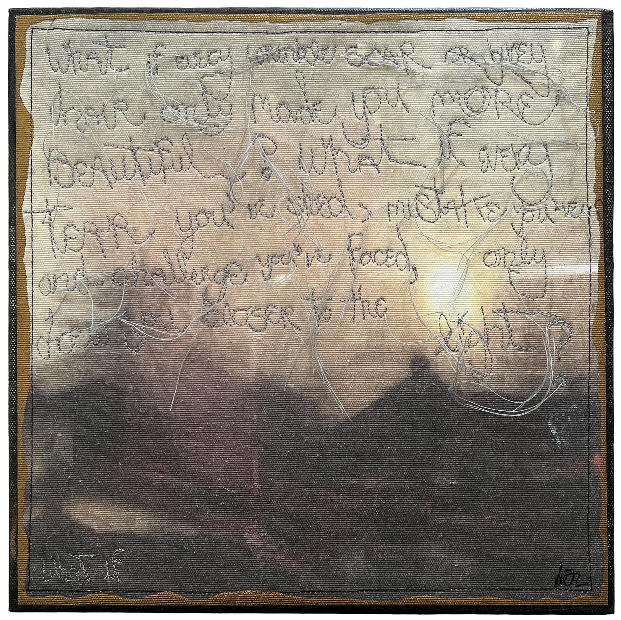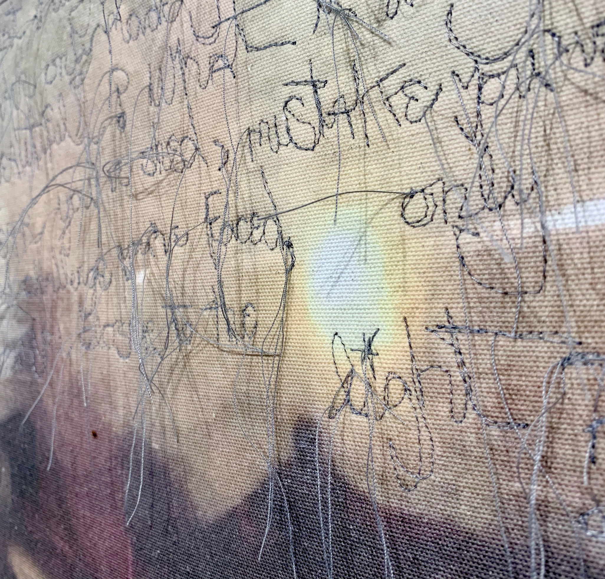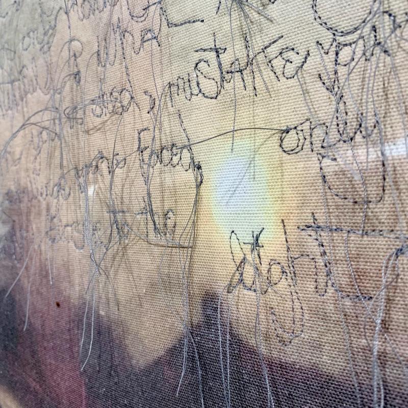 I'm intrigued by reflections, in mirrors, windows, car windows, water, ice, you name it. The reflective quality can give a vagueness to the image, an ambiguity. Stitching with text, readable or not lends a meaning, if you can read it! Image of a reflection in glass printed on digital broadcloth, stitched text & paint.