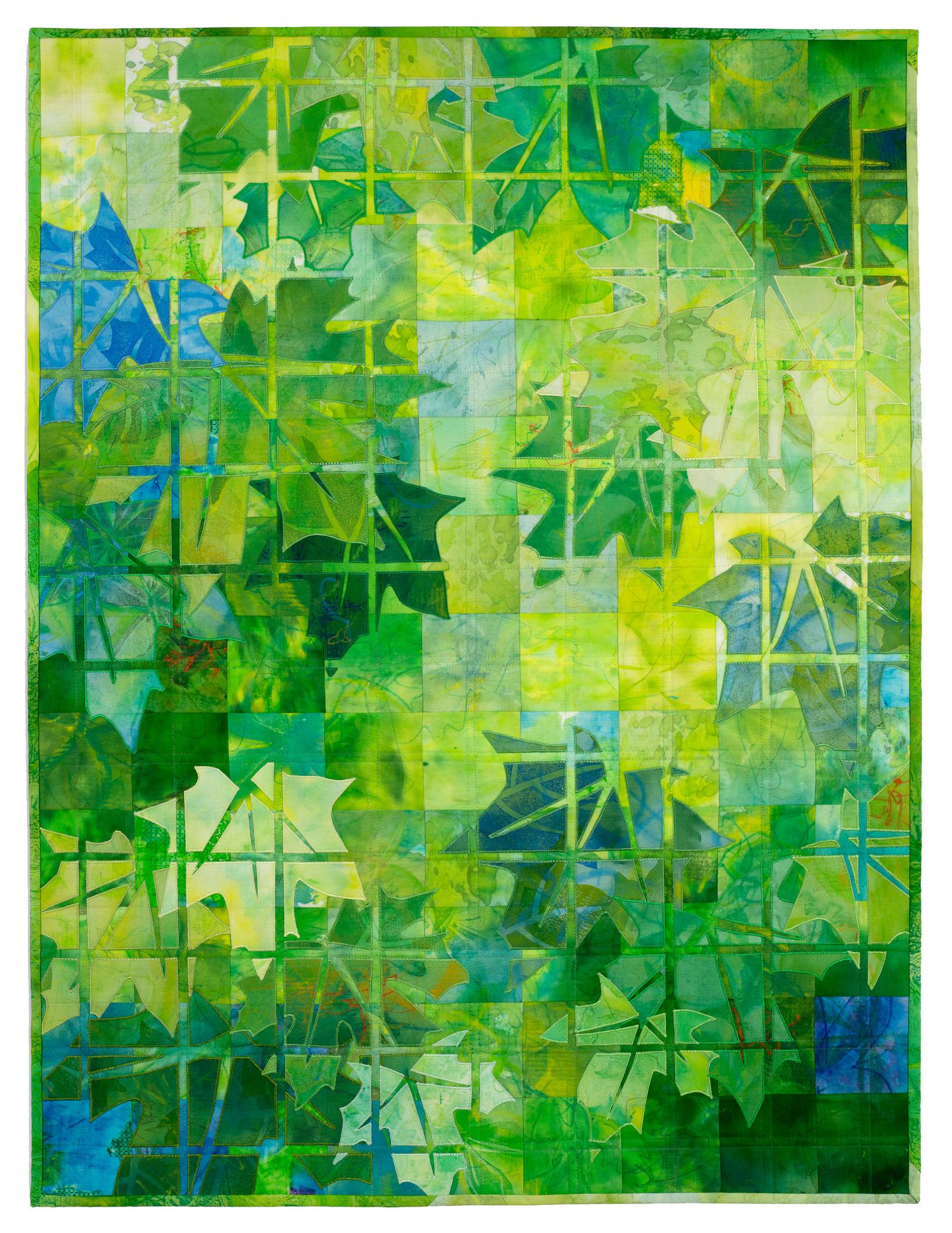 What If? was made during the darkest part of the pandemic. During that time I had been meeting with friends in a grove of trees. The grove and the light I could see through the canopy of leaves became my place of safety and security and a metaphor for a return to joy. I began with a series of abstracted maples leaves drawn at multiple scales. I chose the maple leaf because its many indentations would permit other leaves to be visible underneath after layering. To further enhance the effect of a profusion of leaves, I used hand painted fabrics that I stamped or sun printed with maples leaves and stenciled more leaves with Pitt Pens. I cut away parts of the appliquéd leaves to create an implied sashing. The resulting grid-like structure evokes a feeling of the stability I so longed for at that time.