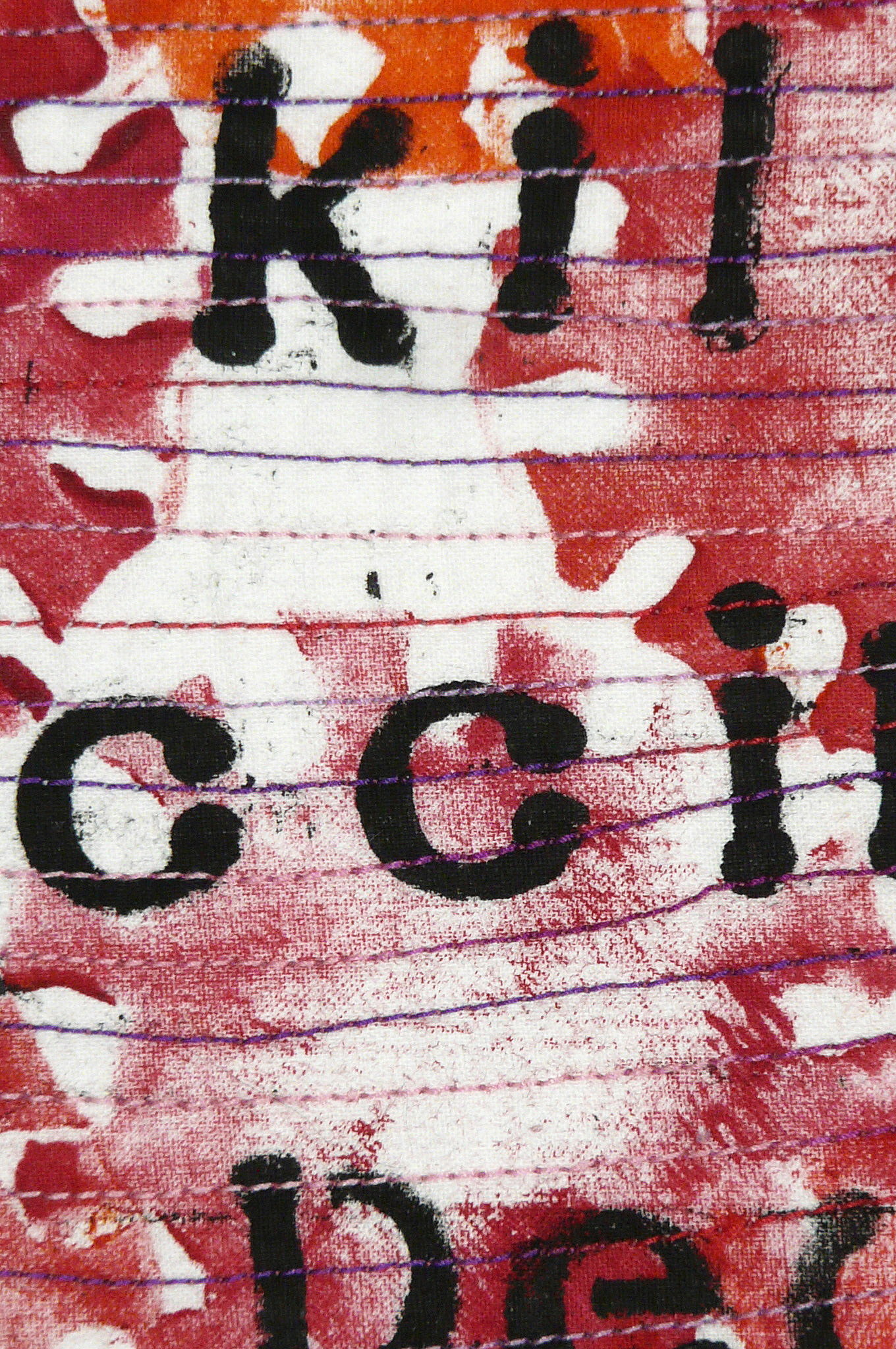 I am angry about the lack of cooperation in following common sense protocols to prevent the spread of COVID-19. And I have heard or read every excuse. In each there is a preponderance of personal pronouns—I, me, my—which really tells the story. An artist-made virus stamp shows the exponential growth. The braid line represents the curve at the time this piece was quilted. It has gone up since then. Almost three years in, we’re still hearing the same excuses about vaccination and COVID precautions.