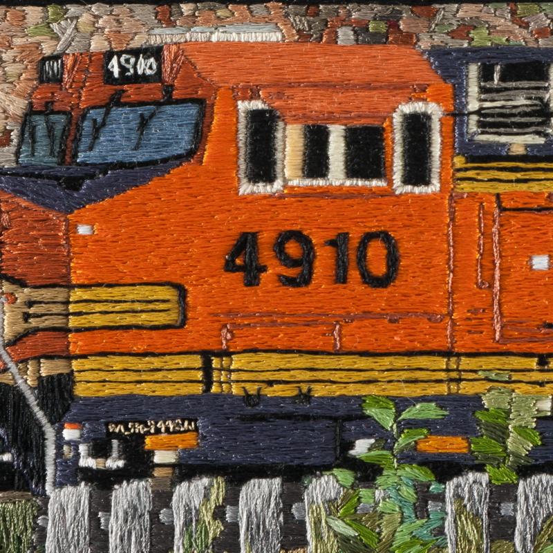 Trains hauling several 737 fuselages are pulled by two Dash-9 Diesel engines attached back to back. This Burlington Northern train passed behind an I-90 overpass in southern Montana on its way to the Boeing assembly facility in Everett, WA. This arrangement looked like the plane was saying something to the engine. It was difficult to resist the urge to honor the geniuses at Pixar by putting eyes in the windshields.