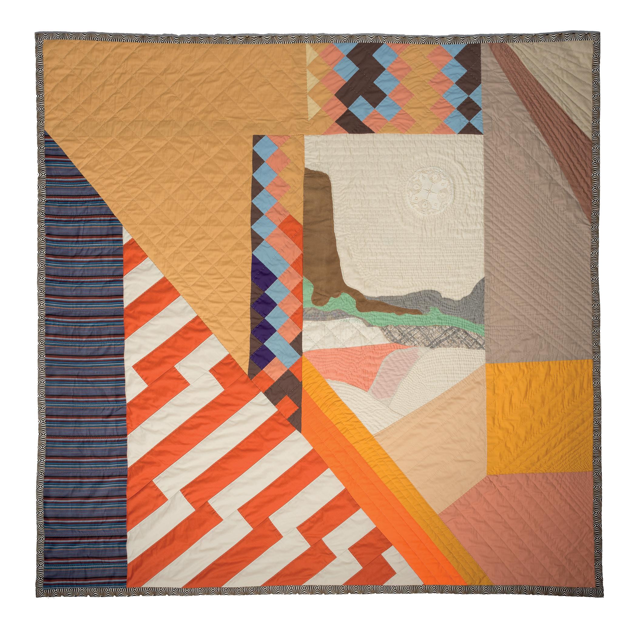 One of several California landscape-inspired quilts created by Schulze in the mid-1970s, the work references traditional quilt blocks but visually and metaphorically looks beyond the patterned foreground to an impressionistic California vista. Like many quilts from the mid-1970s, it illustrates the artist’s urge to apply new designs and techniques while still honoring the traditional quilt medium.