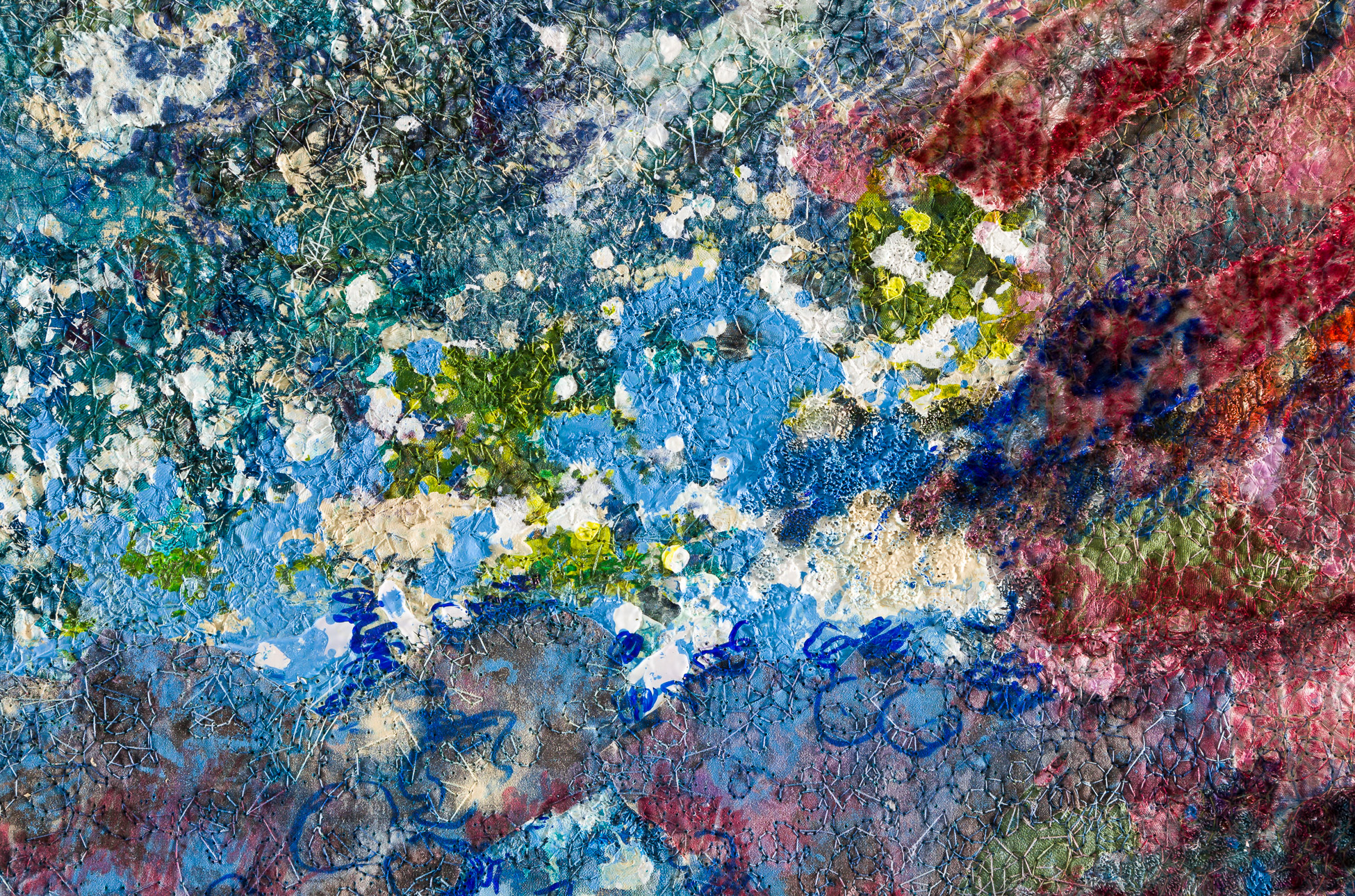 The sea is a strong force, and when it meets the shore the water ripples, light sparkles and waves crash against the rocks. In this case I made the rocks volcanic, like those in Hawaii and other islands, that have emerged from the sea as volcanoes.