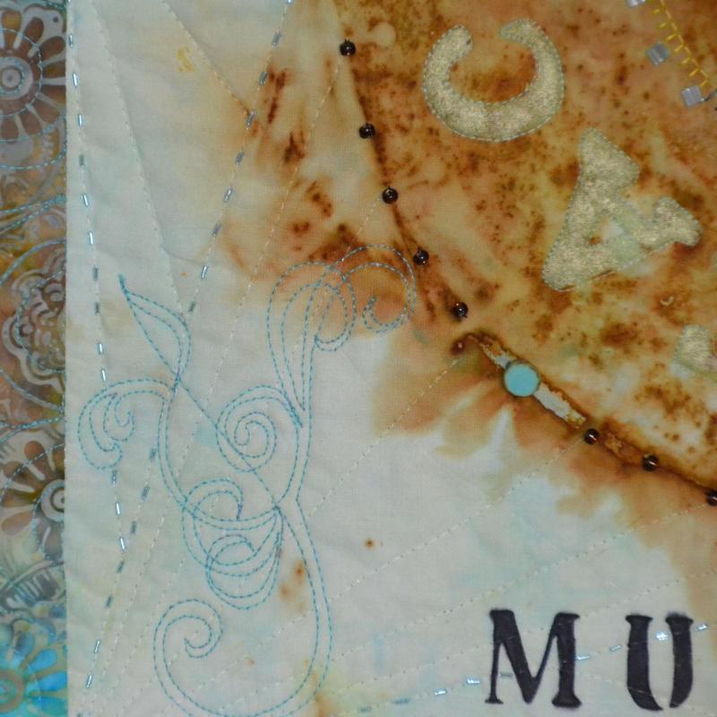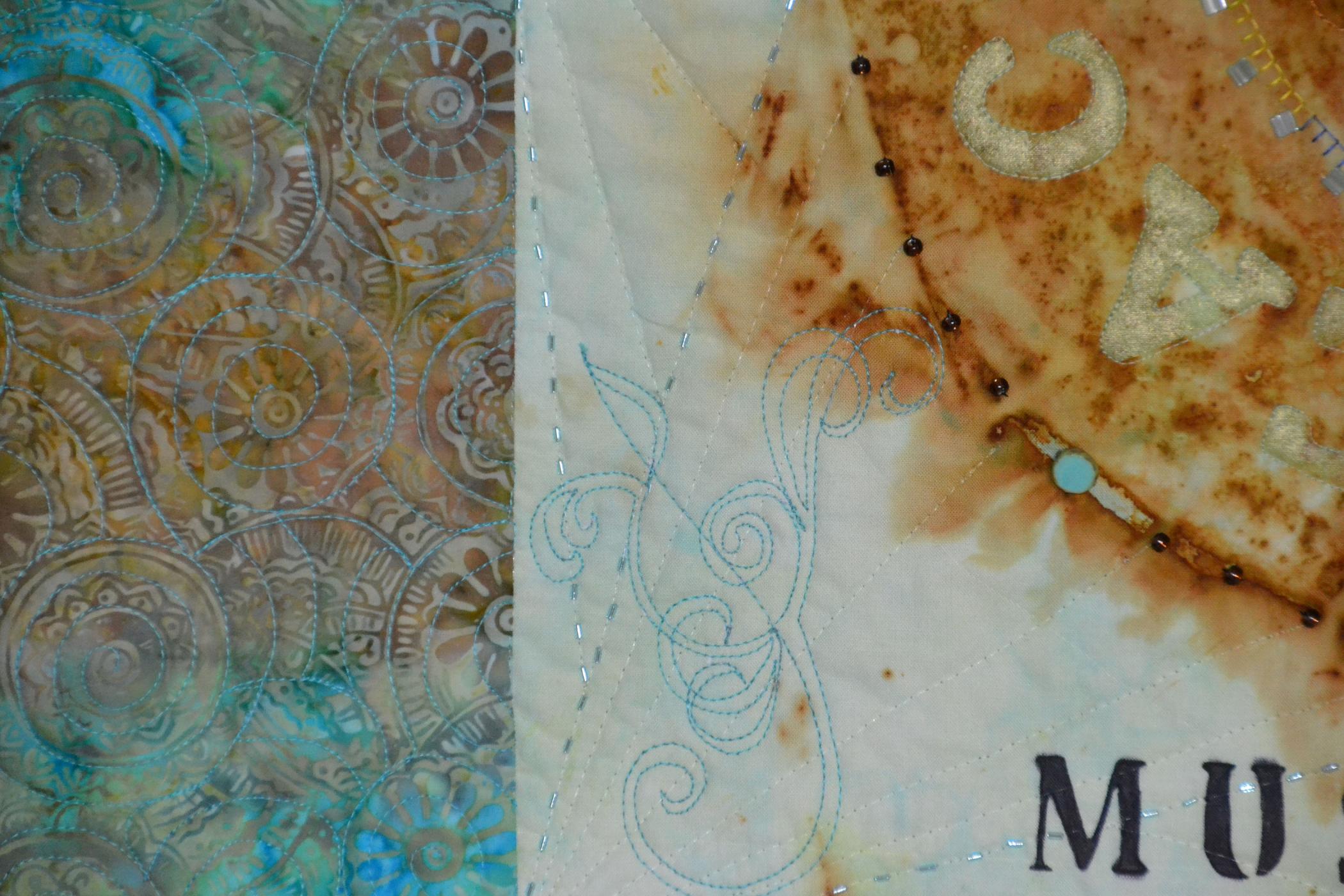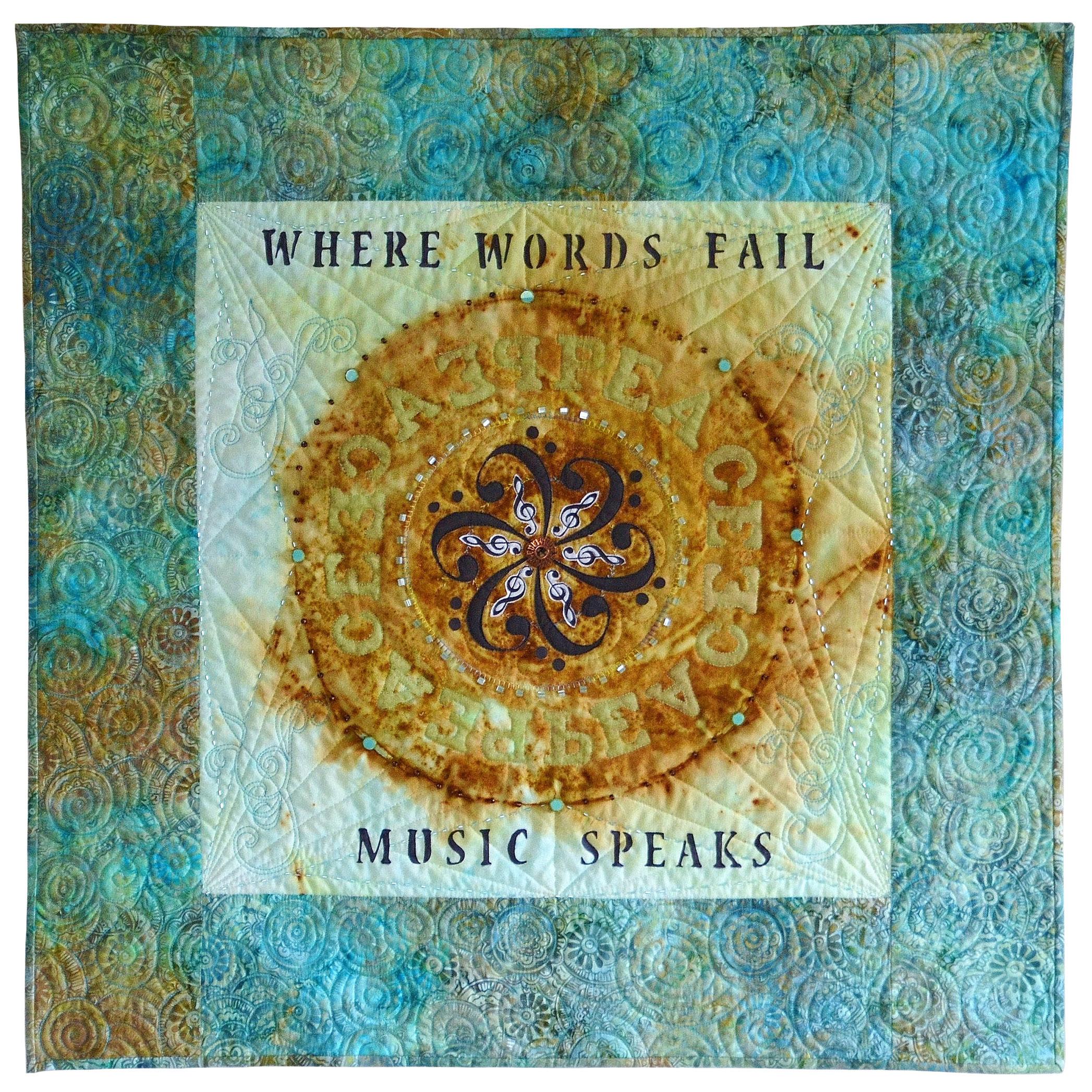 This piece was born out of a need of mine to rise from depression. As a musician I know that music has properties to heal the body, mind and soul. When there are no words, I will resort to music. A photo of this quilt was sent to a family friend whose mother suffered from severe Alzheimer's Disease. She had not spoken in weeks. Upon seeing the photo, she a musician herself, began to point out all the different musical symbols and speak their name. Words may fail, but music speaks.