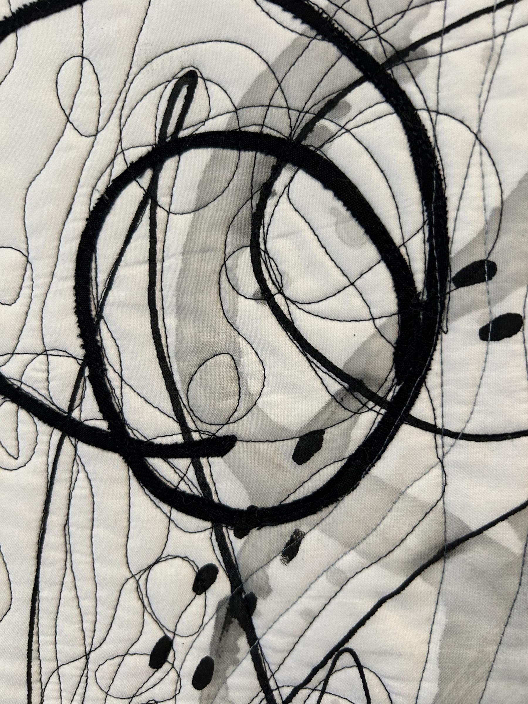 This abstract piece brings to mind a vision of the path of the storm as the winds whip up and whirl about. The gestural marks I make are intuitive, abstract, and continually a surprise. As the pigment lands on the fabric, my challenge is to engage with the marks and make them a part of my design. Free-form ‘scribble’ quilting lines were added to extend the design and integrate the artwork.