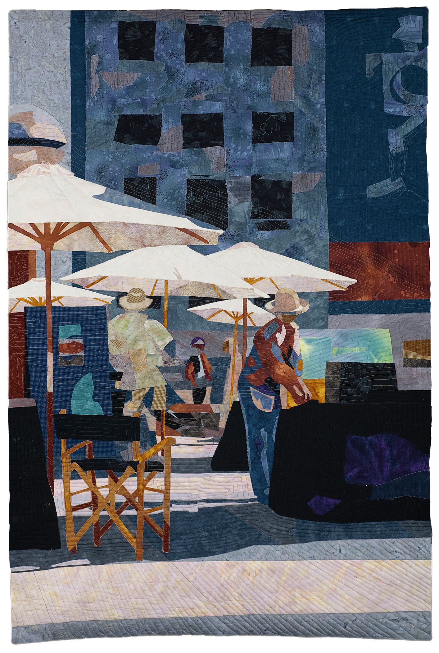 This artwork nicely contrasts the in- focus white umbrellas with the abstract background and morning activity of an outdoor fair. In choosing this image, I was drawn to the interesting architectural shapes and the strong light and shadow. A repeating theme in my artwork is the relationship of people to one another and to the outdoors. The mood of this piece is supported well by the sweeping lines of the machine quilting.