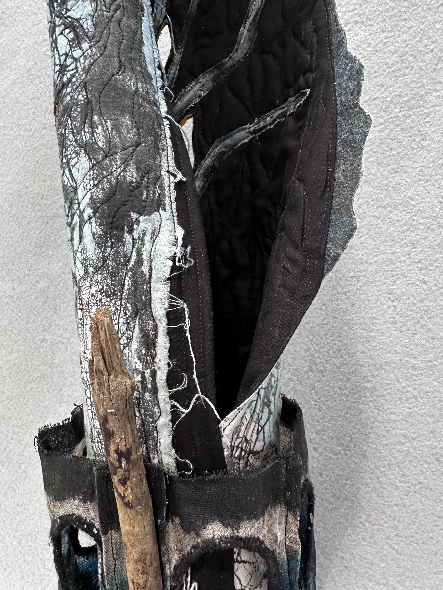 Linen, cotton, acrylic paint, beeswax, wood, waxed thread