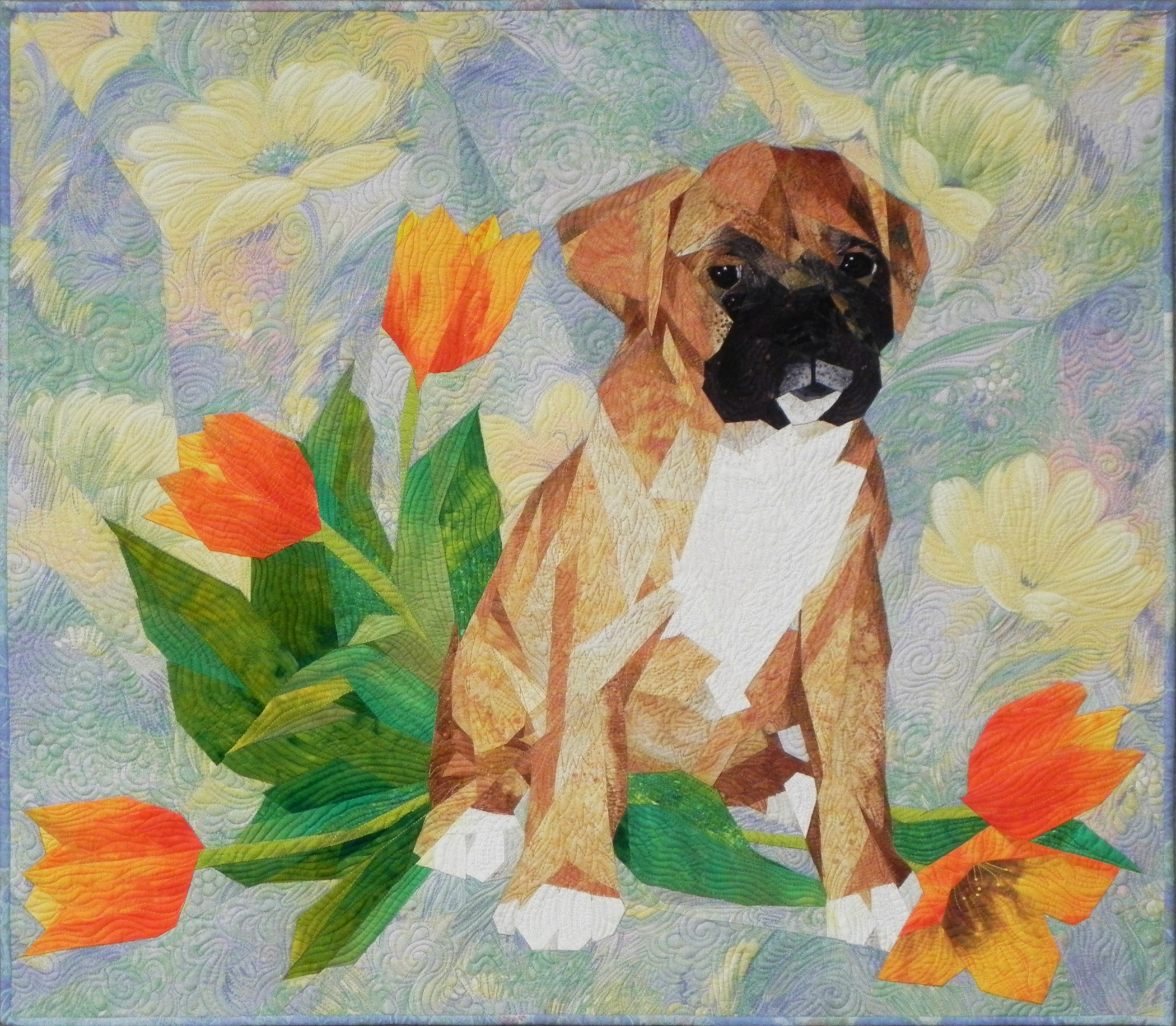 This mischievous puppy has found a way to get noticed! As a gardener AND an art quilter, I just had to piece this whimsical puppy who's photo I took one day. The tulips were added from my imagination, so I had a combination of a photo and a sketch to work from.
