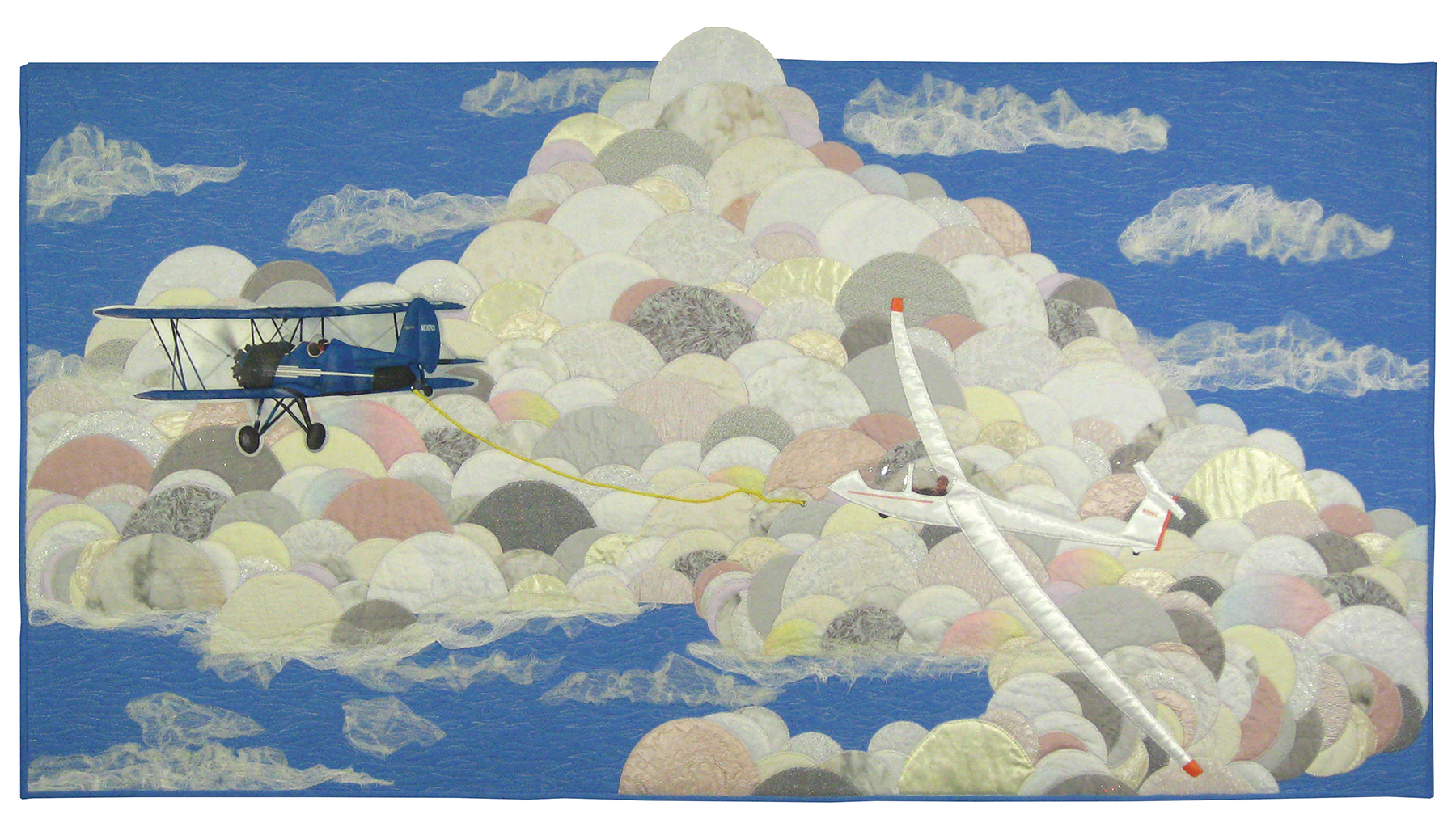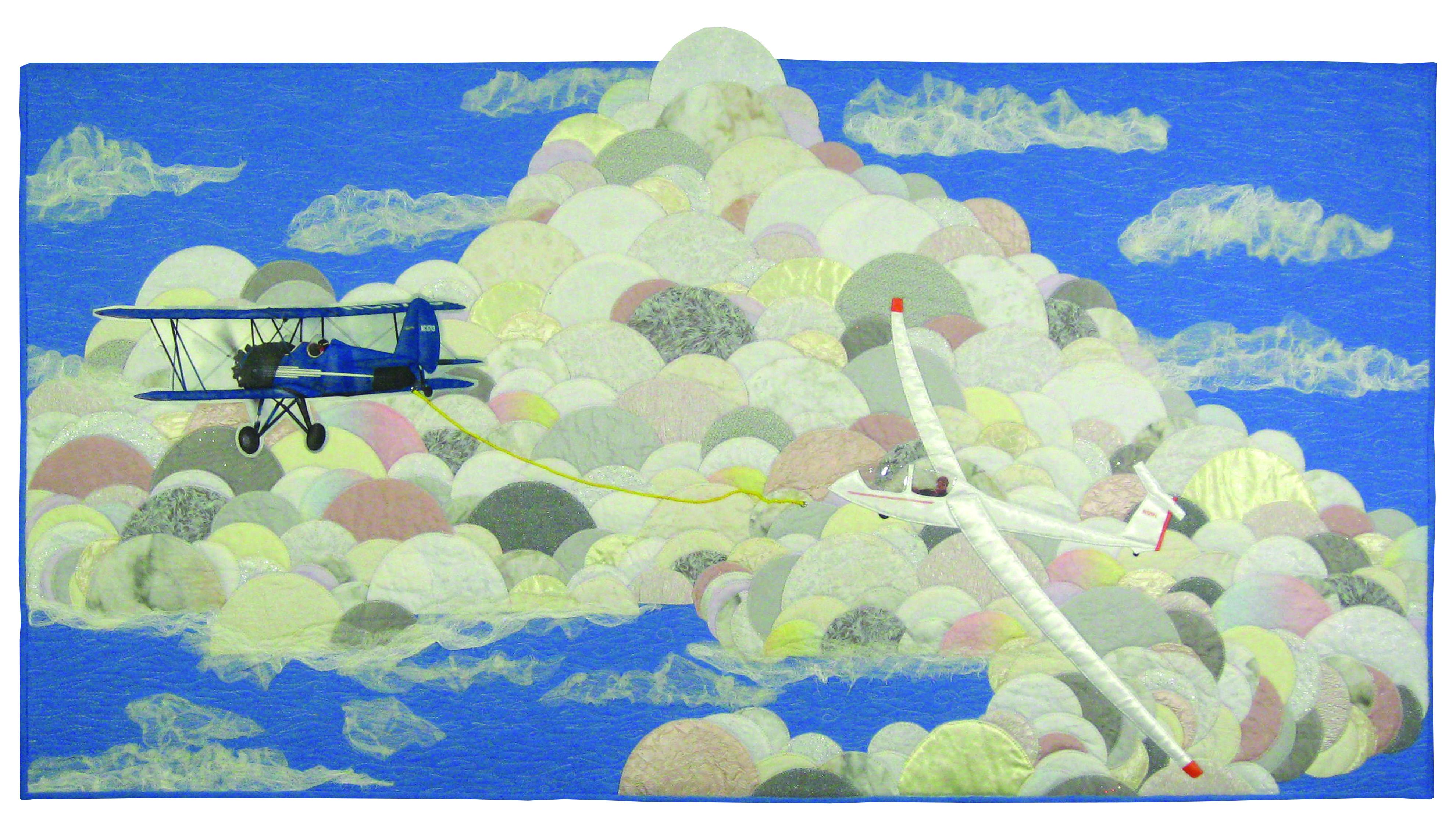 Through the years my husband has been fortunate to own and fly many types of aircraft. Portrayed are two he has been lucky to call his own - a 1931 TravelAir open cockpit bi-plane and a Schleicher high performance sailplane/glider. The glider is dependent on motorized aircraft to tow it aloft. Once the high tensile-strength towrope is released by the glider pilot, he seeks thermals rising from the earth's surface creating clouds which allow his journey through the sky.