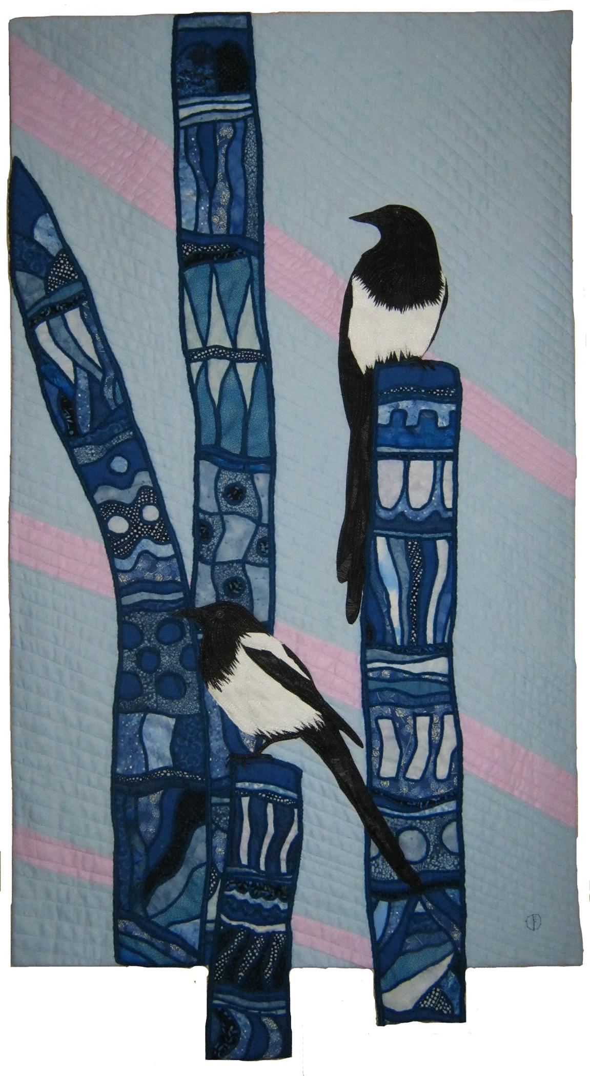 The impetus for the creation of this panel was the picture of Monet "Magpie". I really liked the flavor, long shadows on snow and black-and-white bird on the gate. Shadows Monet transformed into decorative trees, poles, and was forty-two - way more fun.