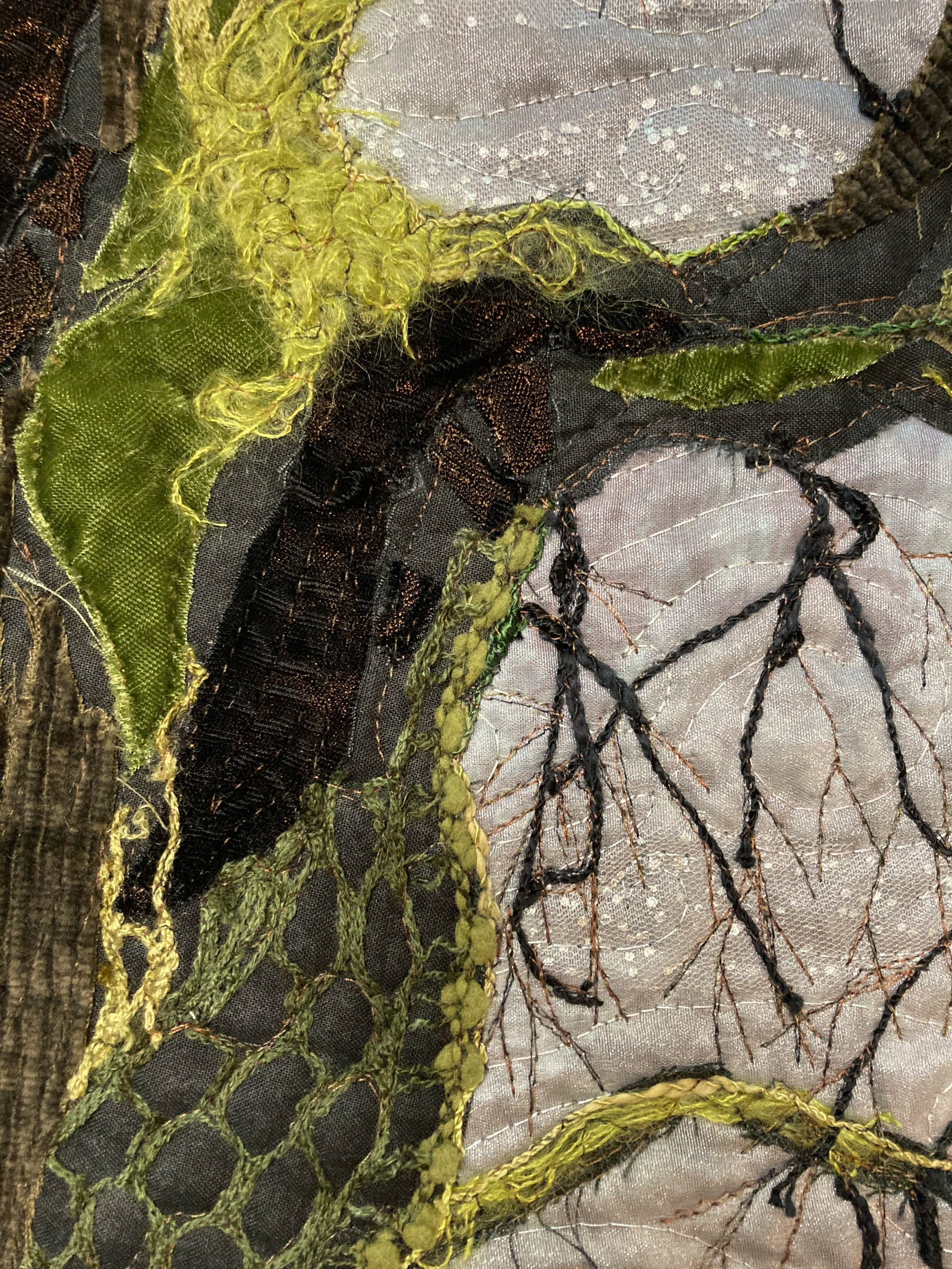 I spend a lot of hours riding my bicycle in the remote hills west of my town, where I have plenty of time to observe the changing seasons. Winter, though usually cold and dark, is full of drama and beauty. I was drawn to this gnarled moss-covered tree, backlit against a roiling storm sky. To me it captured the essence of winter in my world. I came home to see what I do with the image in fabric, hoping to exaggerate the elements in order to convey my experience.