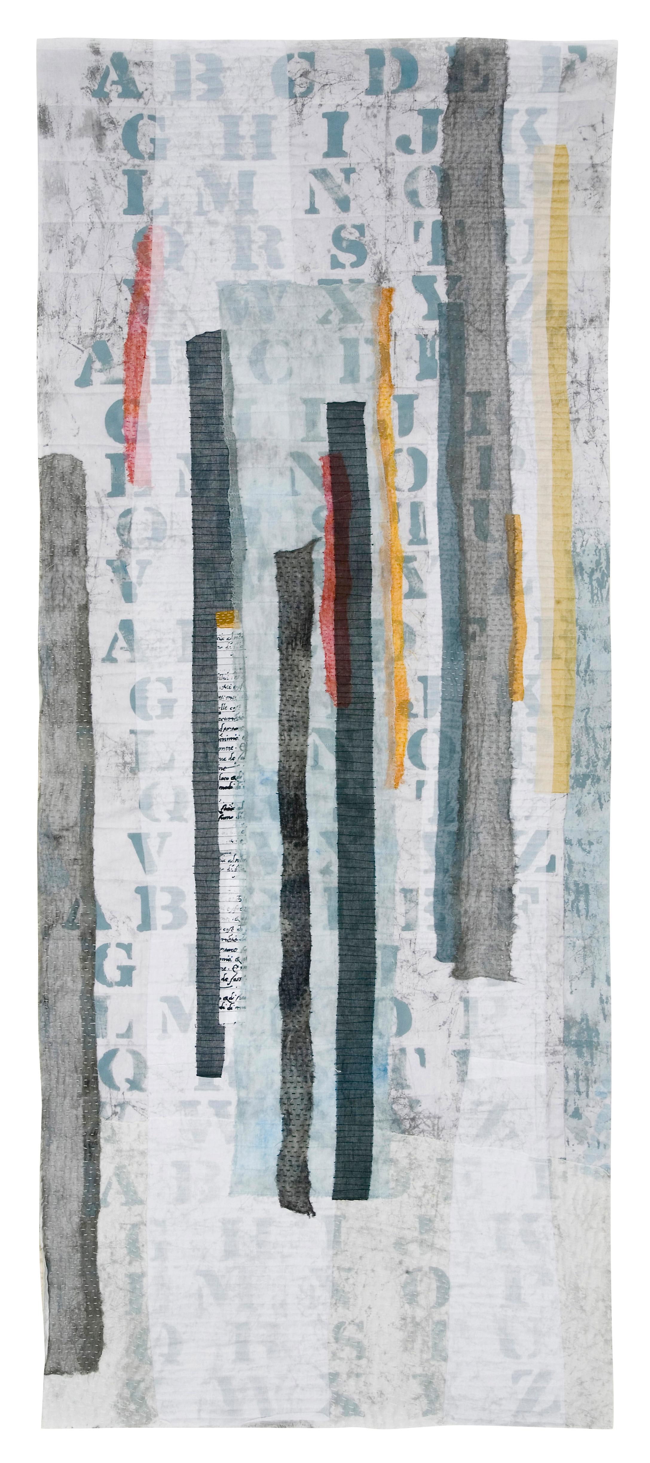 Flour-paste resist, stenciled, screen printed, collaged, hand and machine quilted