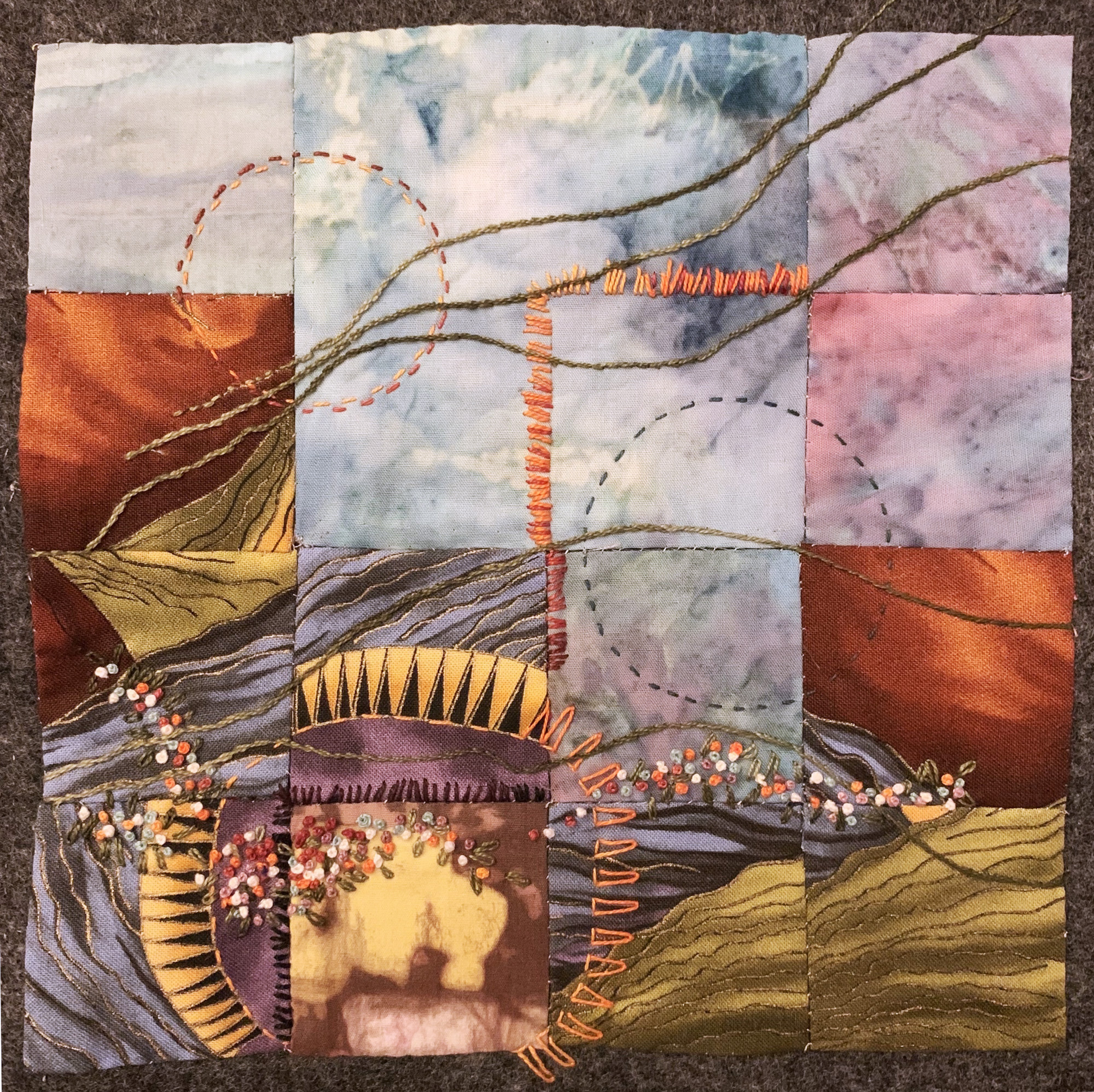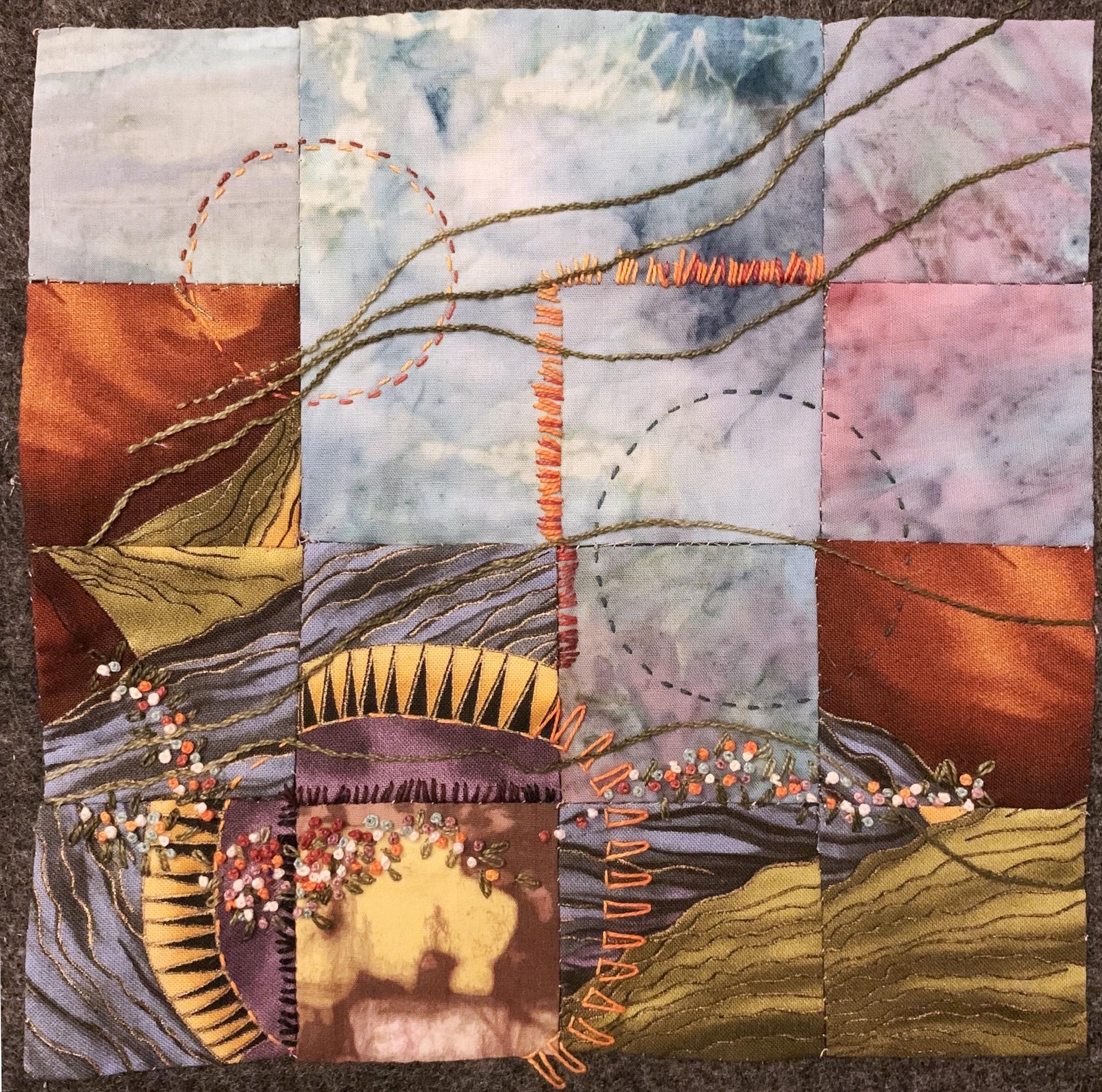 Browse the Collection Wispy Day Carole Frocillo Size 8 in x 8 in (20 cm x 20 cm) Year 2020 Related Publications Art Quilt Quarterly - #22 Price $0.00 Buy Now >> Created for my daughter on her birthday while in the midst of social distancing. The celebration became, for lack of a better term, wispy. It felt lost in the bigger National and global moment. Materials Commercial and hand dyed fabric, Techniques Hand sewn