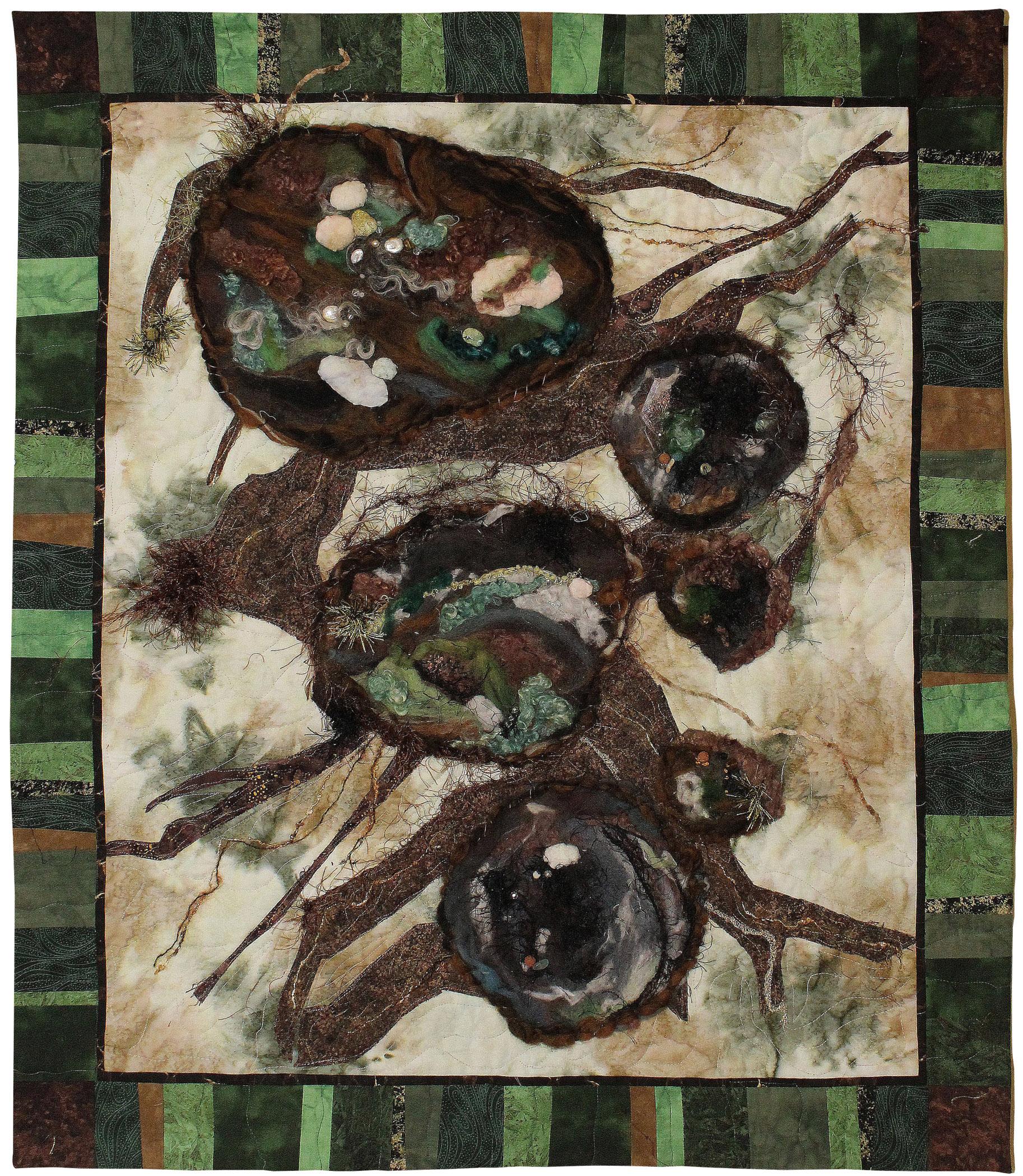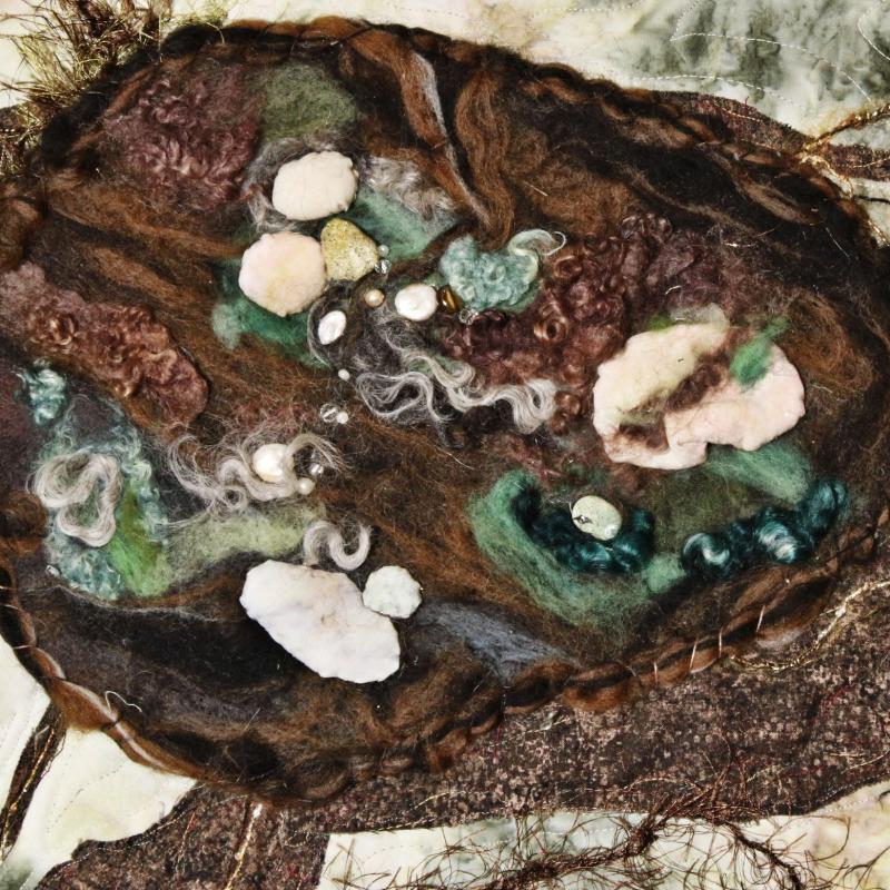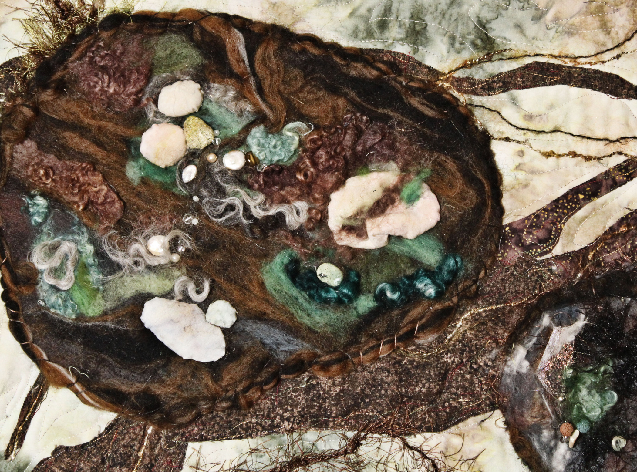 Take a walk through the forest. Look down at the earth. Look closer. You will see roots of trees emerging and disappearing through the earth. And if you look closer still, you will see small pockets in the roots which are microcosms of beauty: moss, stems, pebbles, and other elements formed by nature. I see beauty in the unusual, and art forms in the tiniest, unnoticed places. This fiber art piece is a representation of the natural finds hidden in plain sight.