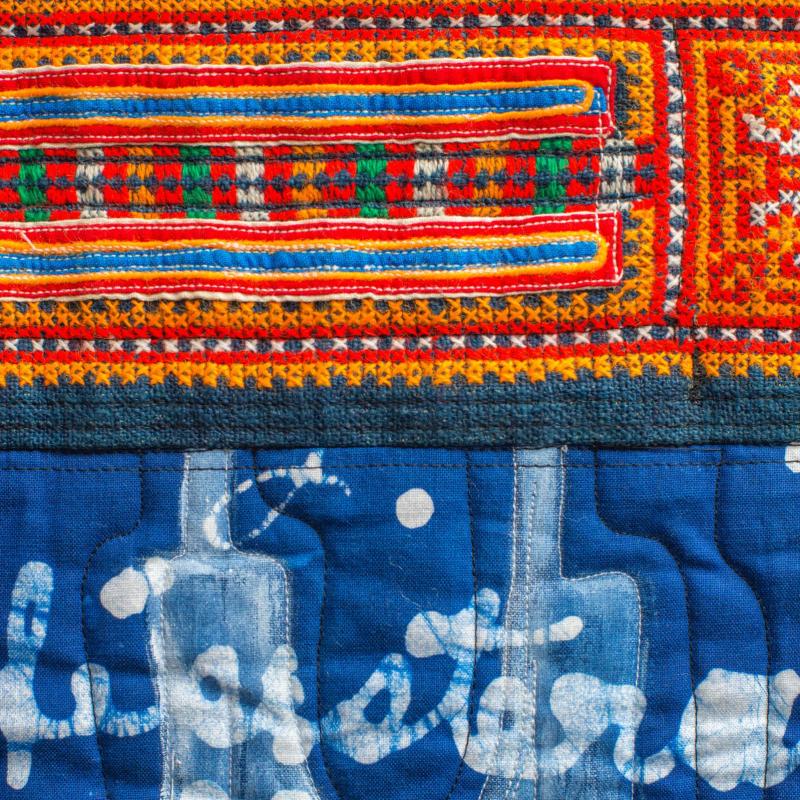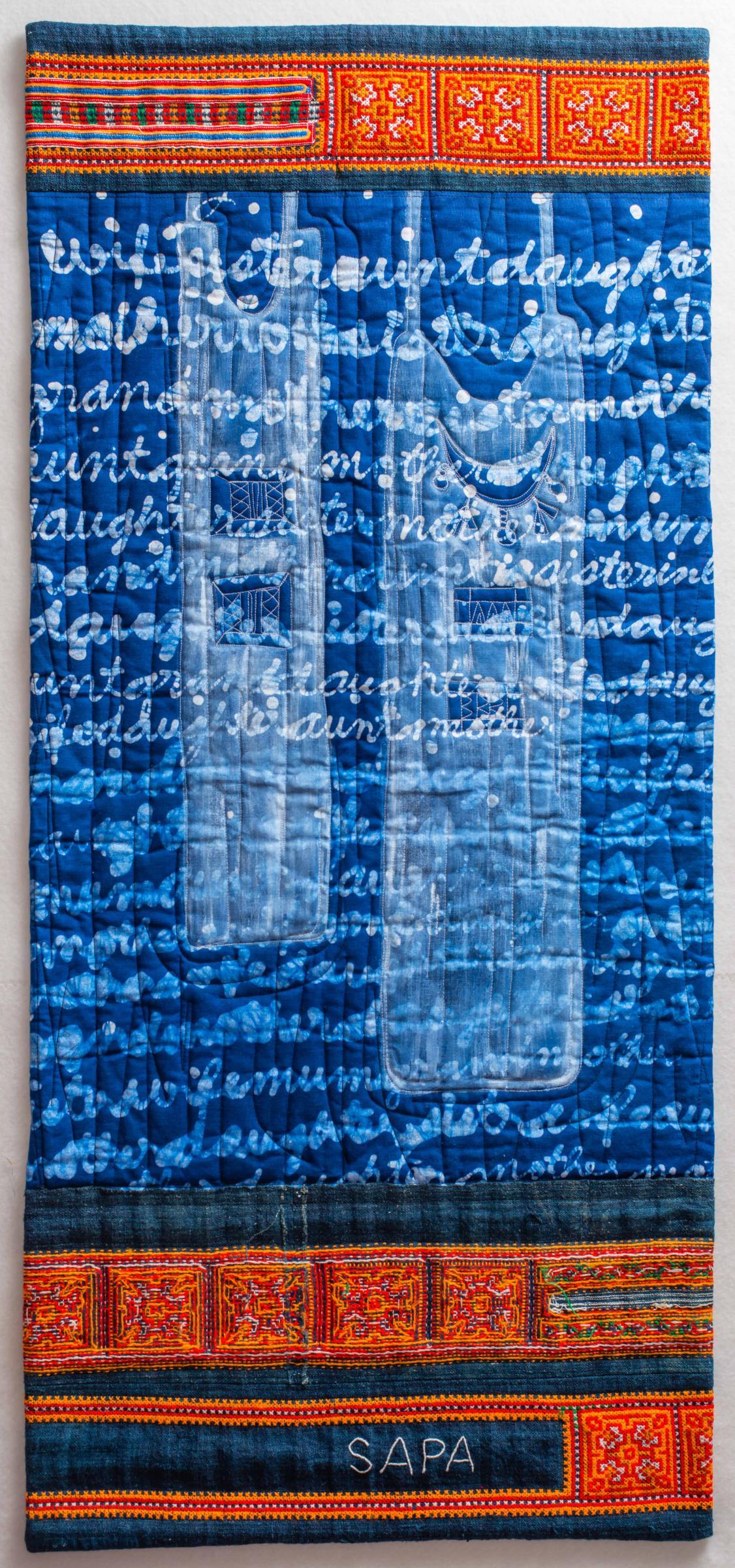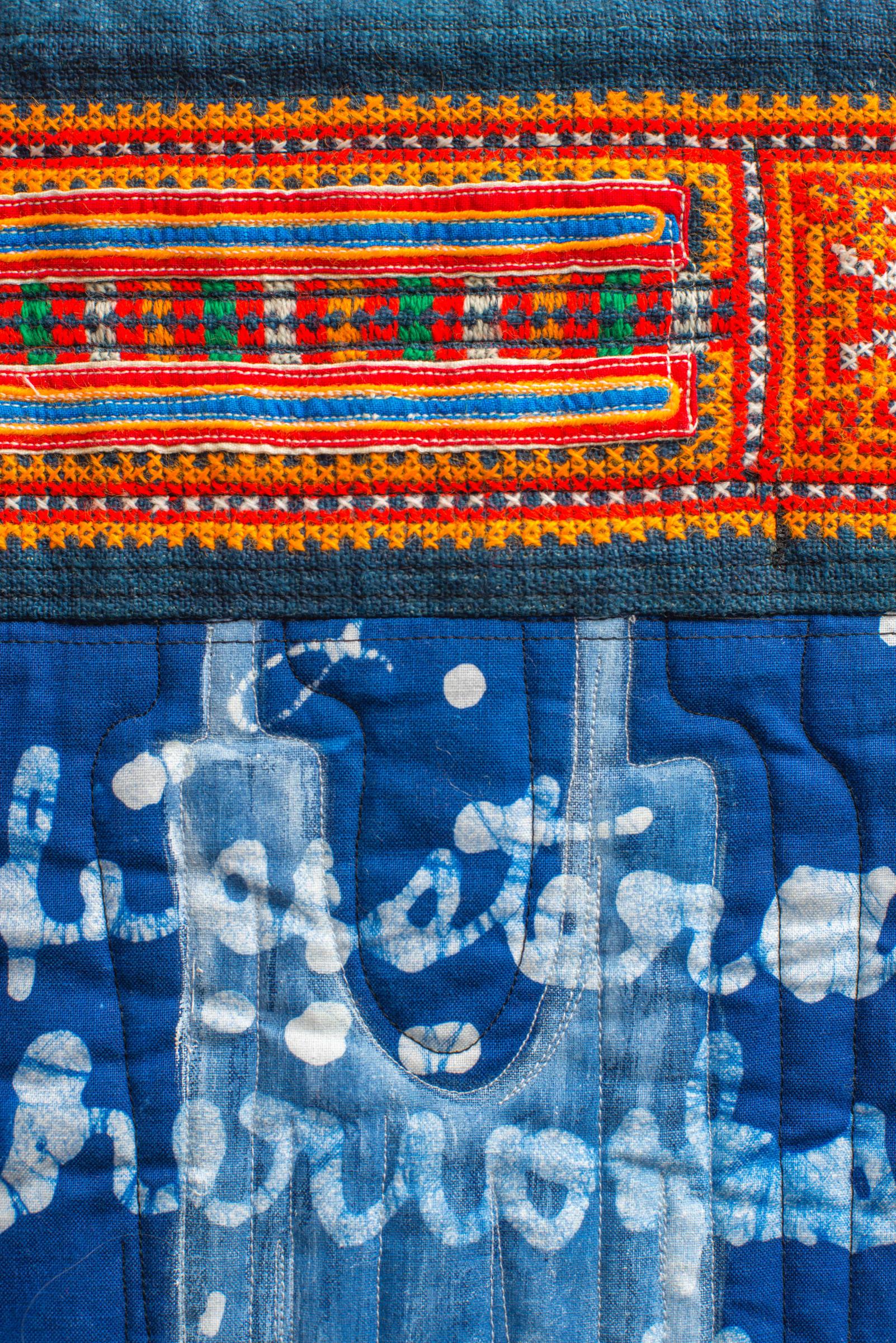 Women in Sapa, Vietnam work hard in their family roles and those of farm worker, textile producer and seller. I made the batik text in the central section which lists familial roles while the three short woven hemp, indigo dyed with embroidery strips, showcase the needle skills of the women from Sapa. I have reversed the strip under the batik to show the hidden side of the piece, just as we don't see all that women do in a day's work. The necklaces are stitched and hand painted over the batik.