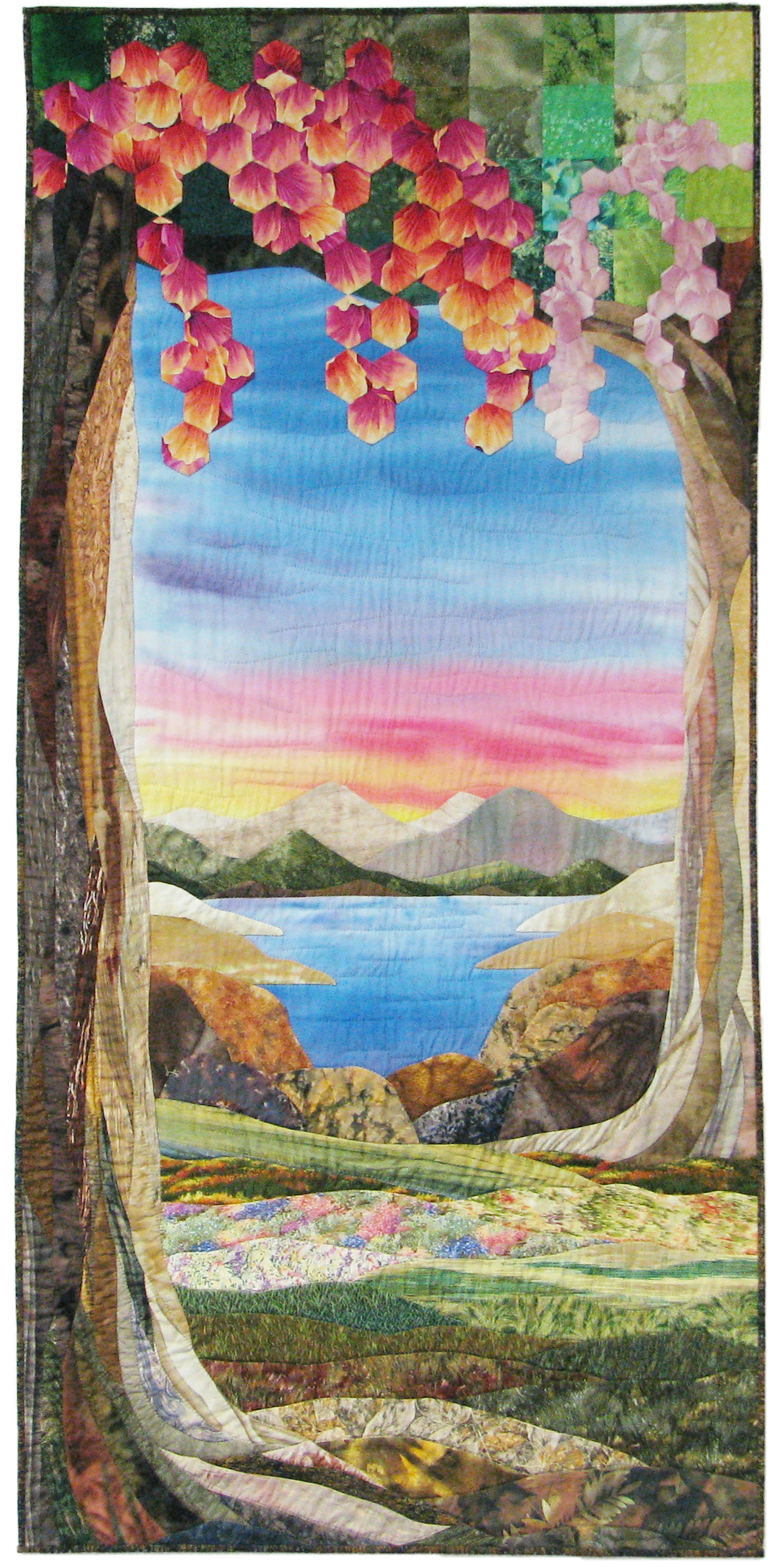 From the Woods is a melding of traditional patchwork and contemporary art quilt elements: Flowering hexagons with a patchwork square background against hand painted sky and water, enveloped in layers of land, mountains, and trees. I made this art quilt when I was still piecing, appliqueing, and quilting by hand, and it was fun to combine all that tradition with my hand painted fabric. For twenty years I have designed and made landscape quilts, and I've taught miniature landscape lessons for the past fifteen. Land and waterscapes are the reason I began exploring hand painting fabric, which has lead me to new art quilt techniques and designs.