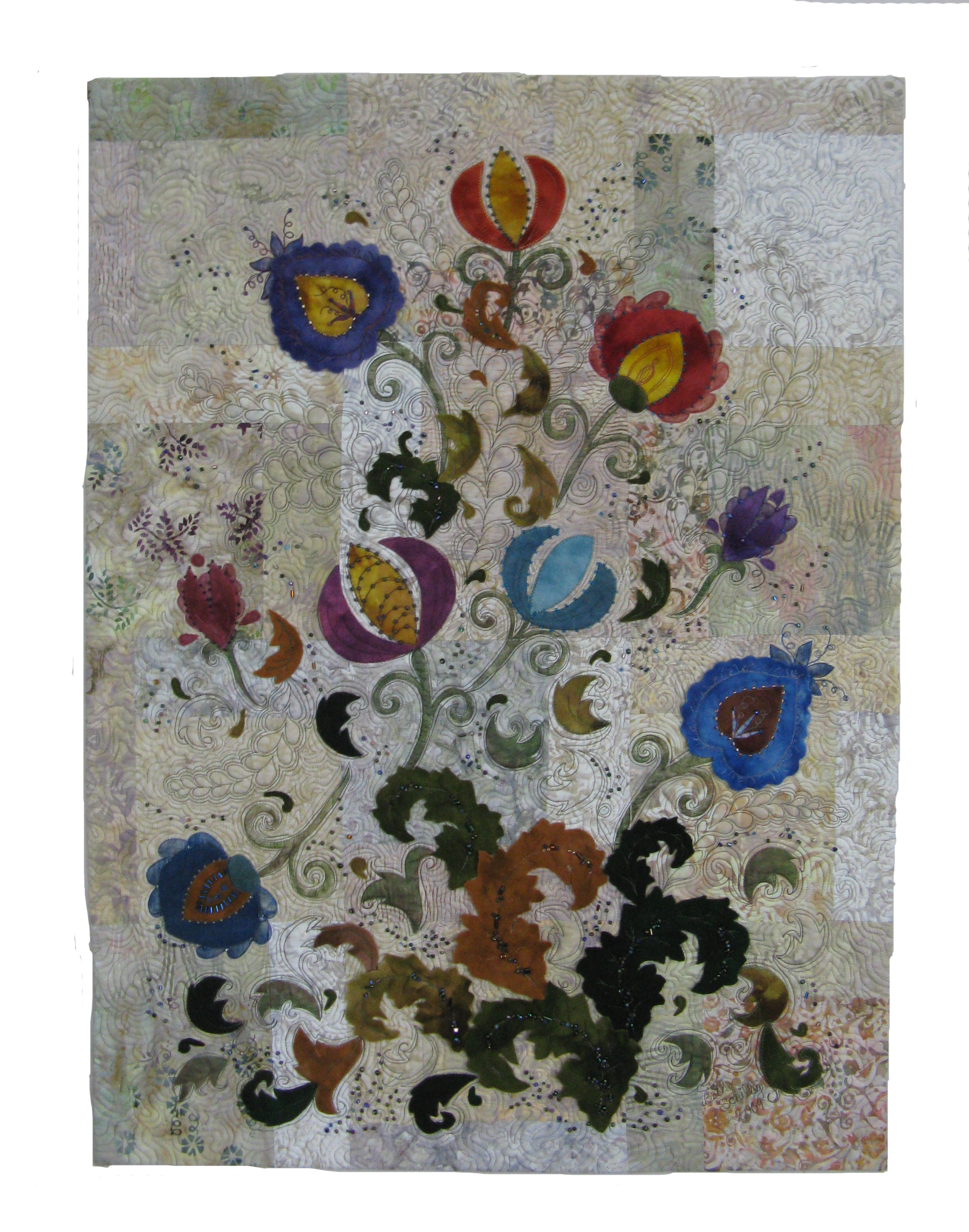 The background is composed of various commercial batiks pieced in a somewhat random configuration. The flowers & leaves are made from hand dyed felted wool. Some details were added using Shiva Paintstiks and I loved the contrast in texture between the "heavy" wool and the light, almost transparent "painting"! Lots of texture was added with freehand quilting in the background with my domestic machine.